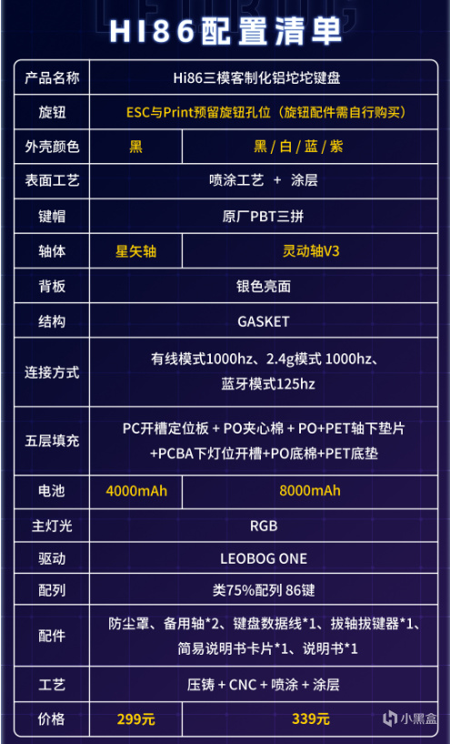 鍵盤配置區分就在於外殼顏色,軸體和電池。這麼看來,339的高配版更值得推薦:更多的顏色選擇、更大的電池,軸體方面則因人而異。並且還有一點是Hi86兩個版本都預留了ESC、Print旋鈕孔位,可以自行購買配件更換,這下是否需要旋鈕或按鍵,決定權就交到用戶手中。