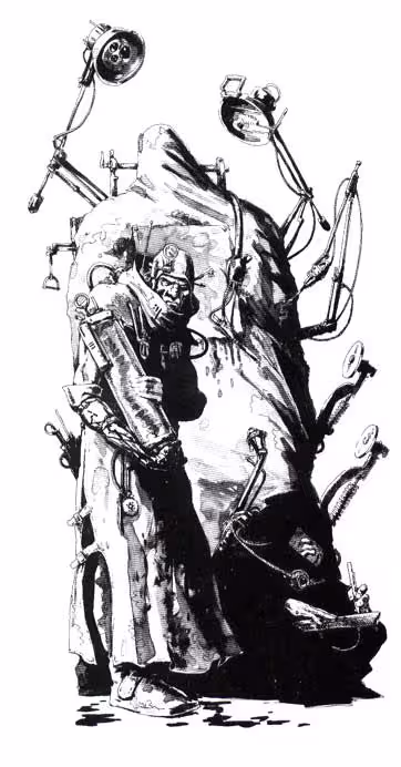 類似於輪胎膠片和昆蟲外殼的植入物,植入身體會在數月內在身體內擴展發育成熟,手術時會留下一些連接孔洞用來接入盔甲和維生系統,做到人甲合一。