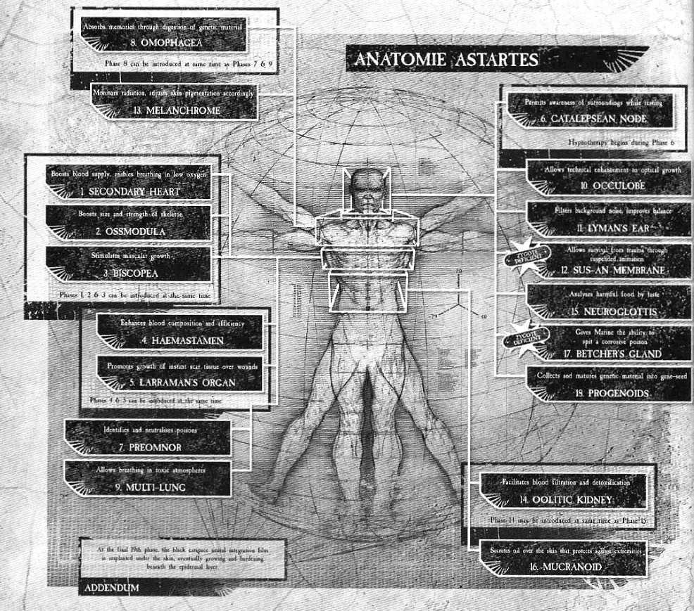 阿斯塔特一共有19道手術改造,原鑄阿斯塔特增加了2道,出於不同戰團的資源配置差距,有些戰團沒有條件完成全部的手術。由於中文聖典翻譯的就是一坨,本人對醫學又一竅不通,所以儘可能用通俗的語言講述,有專業錯誤的話各位理解理解,謝謝!