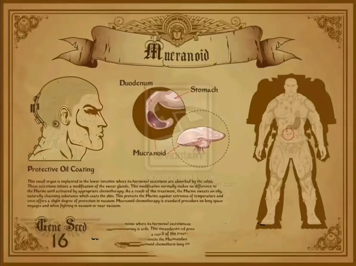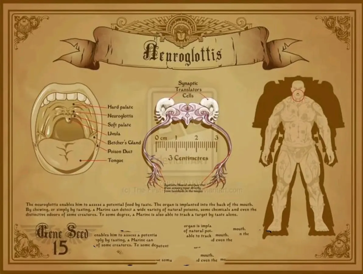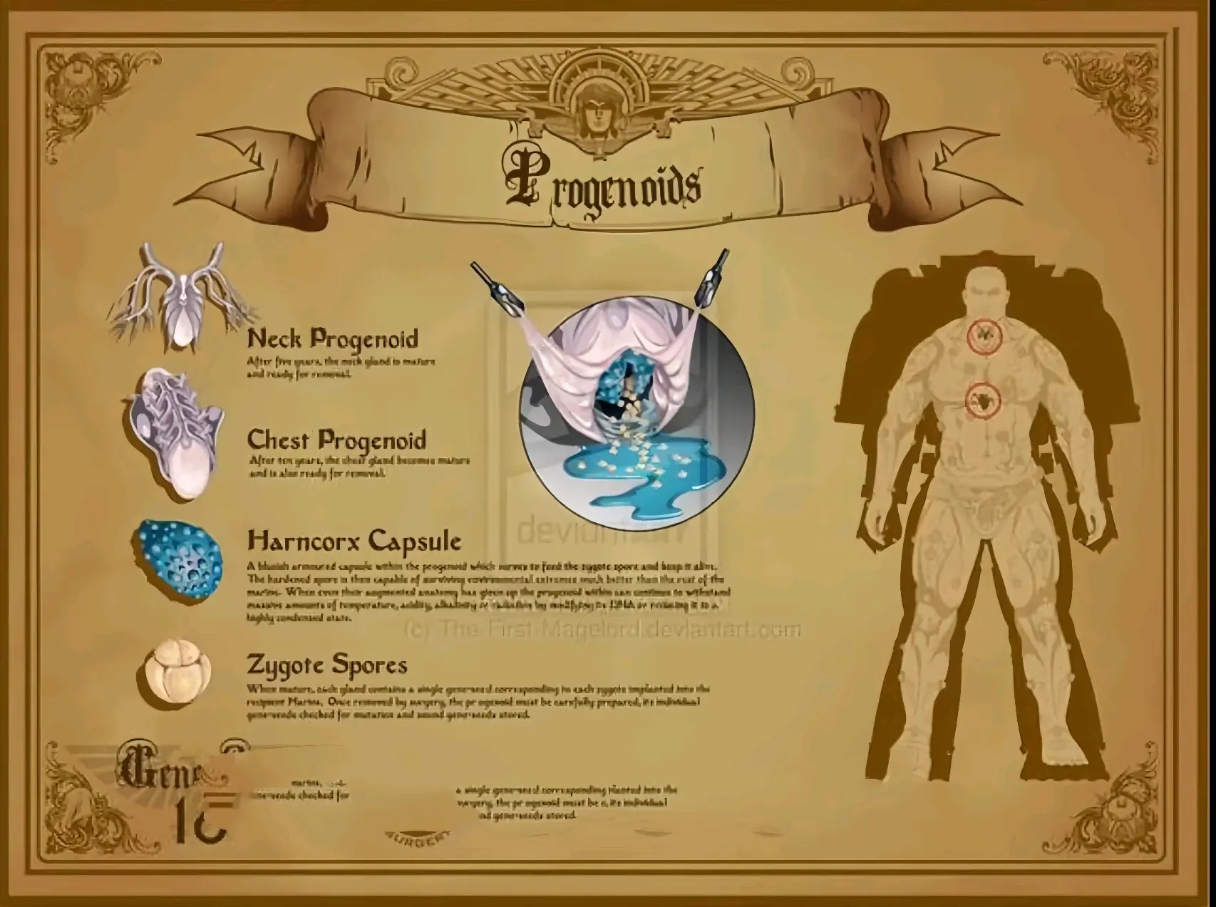 基因種子植入是手術的第0步,這些蘊含了基因原體力量的遺傳器官會被植入到新兵的喉結和胸腔位置,並大幅增強其體魄以便防止接下來的手術排異。