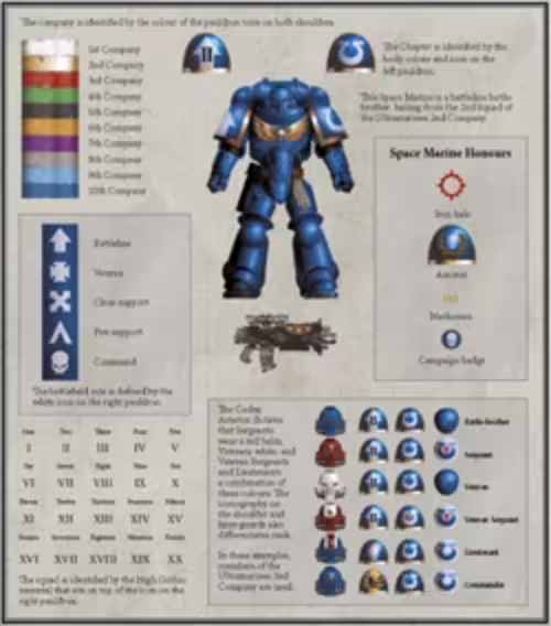 把這個看完,以後看到一個星際戰士你就知道他的具體信息了,雖然實際上這個僅能拿來看看極限戰士,很多團並不遵守這些規則,就連極限戰士的子團都有些許變動。