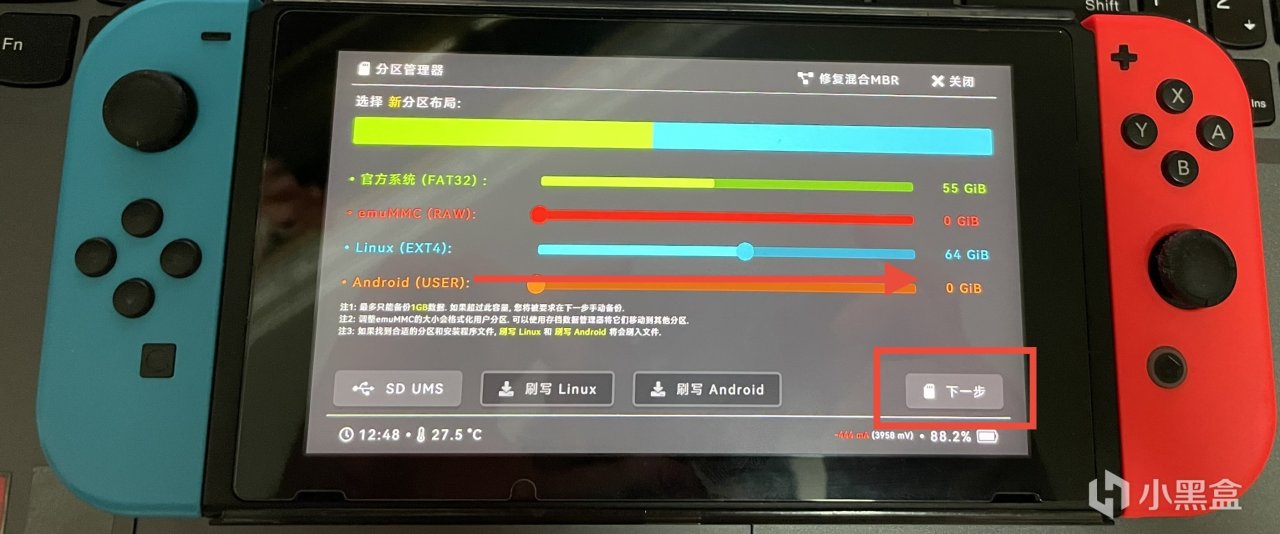 注:如果你需要安裝很多的軟件,建議適當增加空間,後期空間不夠想拓展空間會很麻煩,而且會有數據丟失的風險!(32G內存的Switch除安卓系統至少要預留32G空間,否則無法克隆虛擬系統,64G同理)