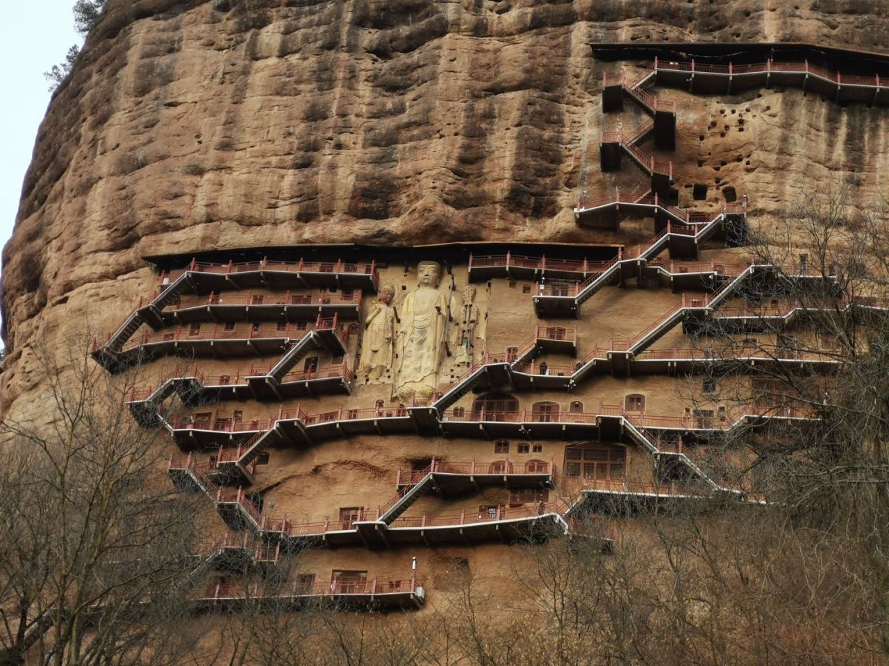 麦积山石窟全貌,几乎全雕凿在近90度悬崖绝壁之上,凭借凌空栈道到达