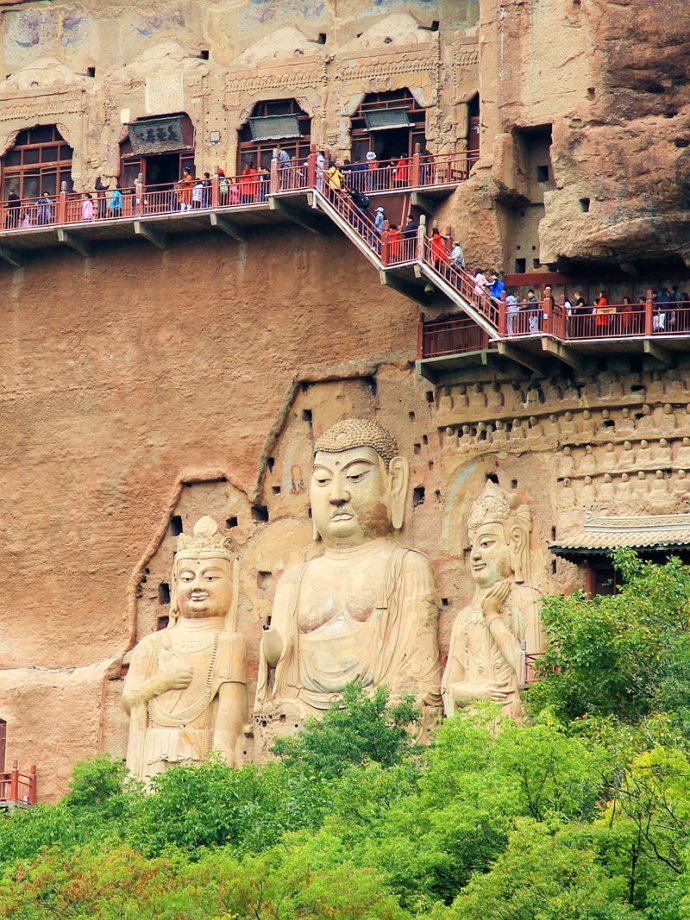 莫高窟中心主体“九层楼”,始建于695年,后经修缮,内供奉世界最大室内盘腿而坐泥胎弥勒菩萨的造像