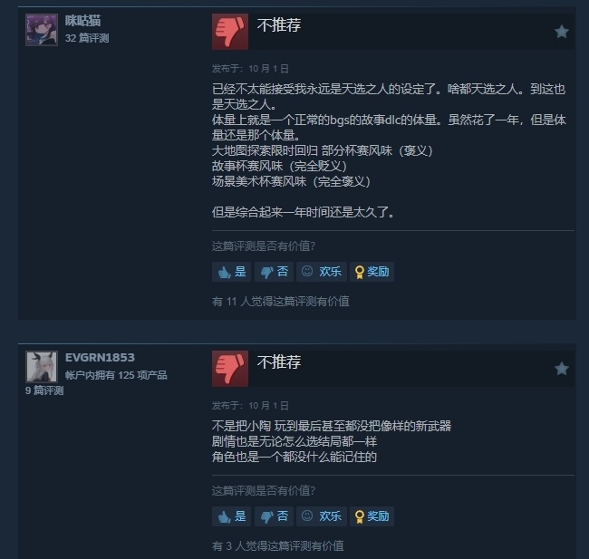 该DLC的评价在Steam上为“褒贬不一”,在629篇用户评测中约有43%为好评。一些玩家认为这是一个“很有意思的DLC”,并称赞其“开放世界大地图探索回来了”。然而,也有玩家批评它“延续了本体的制作水准,也就是毫无起伏情绪调动基本没有的剧情”,并认为它“没有扩展任何玩法,没有改进任何体验,就是一张手工制作的大地图,它更应该作为游戏本体的内容出现而非单独的DLC”。