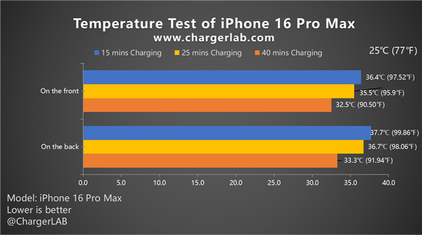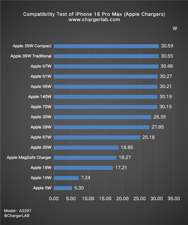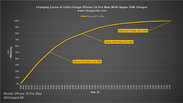 对此,ChargerLab搭配一系列苹果、第三方充电器,详细测试了iPhone 16 Pro Max的充电功率。