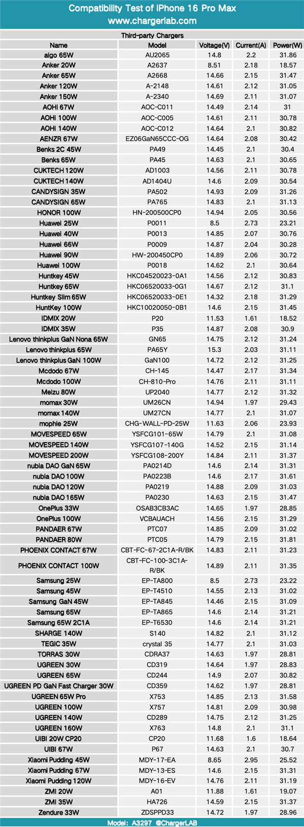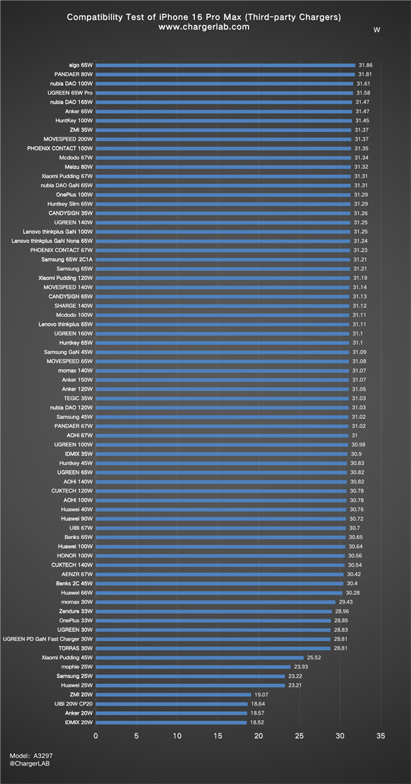 这些充电器都可以兼容iPhone 16 Pro Max,但最大功率也只有30W出头,足以证明这就是极限了。
