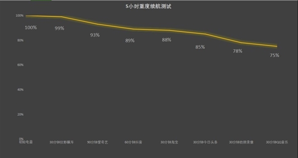 测试模拟了大家日常的使用习惯,自动亮度全程亮屏,在WIFI网络的条件下5个小时还剩75%的电量。