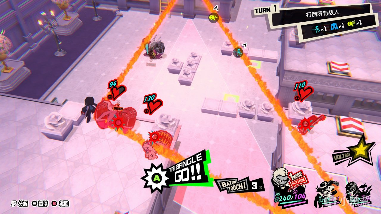 作爲對比的話,P5T是基於P5的人格面具法術,配合近戰與遠程普攻的戰鬥方式,不過核心玩法稱得上是簡約而不簡單——最核心的要素可能很多人知道了是“三角戰略”:打出one more之後,三位角色圈住一個倒地狀態的敵人可以發動威力超強的合擊。