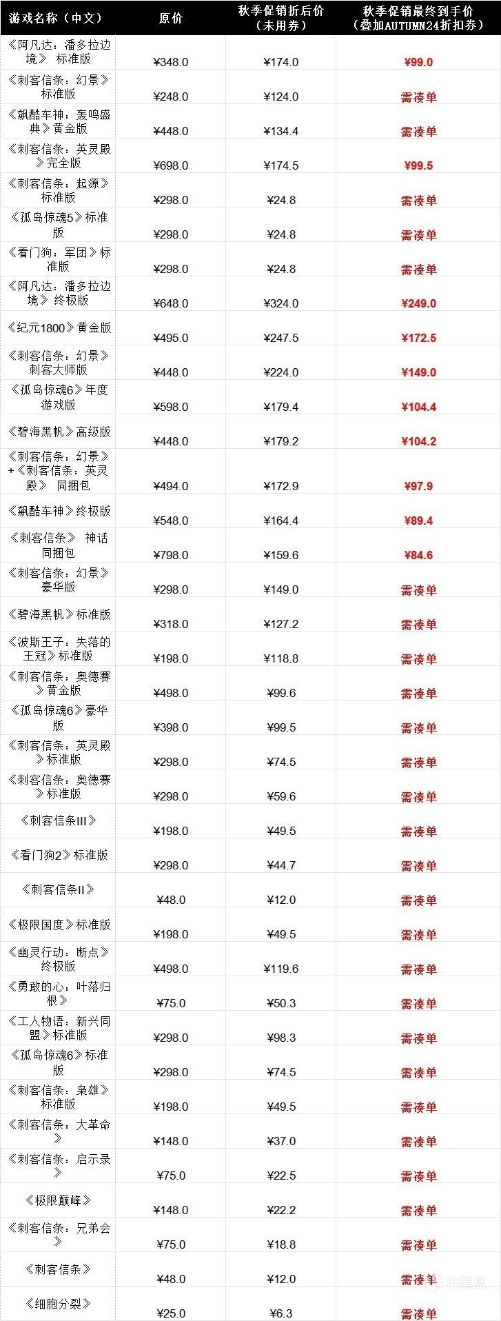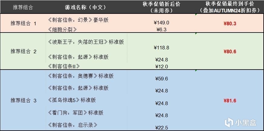 1.《波斯王子:失落的王冠》+《刺客信條 2》+《孤島驚魂 5》(24.8 元三款遊戲任選一款即可),輸入優惠代碼 AUTUMN24 後到手價爲 80.62 元: