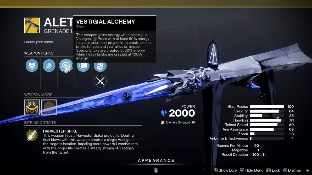 金槍Perk Vestigial Alchemy:該武器在拾取亡魂後會獲得能量,在至少獲得50%的能量時可以長按換彈鍵進入特殊射擊模式,使用特殊射擊模式射擊後會爲全隊生成彈藥盒。50%能量會生成綠彈盒,100%能量會生成重彈盒。