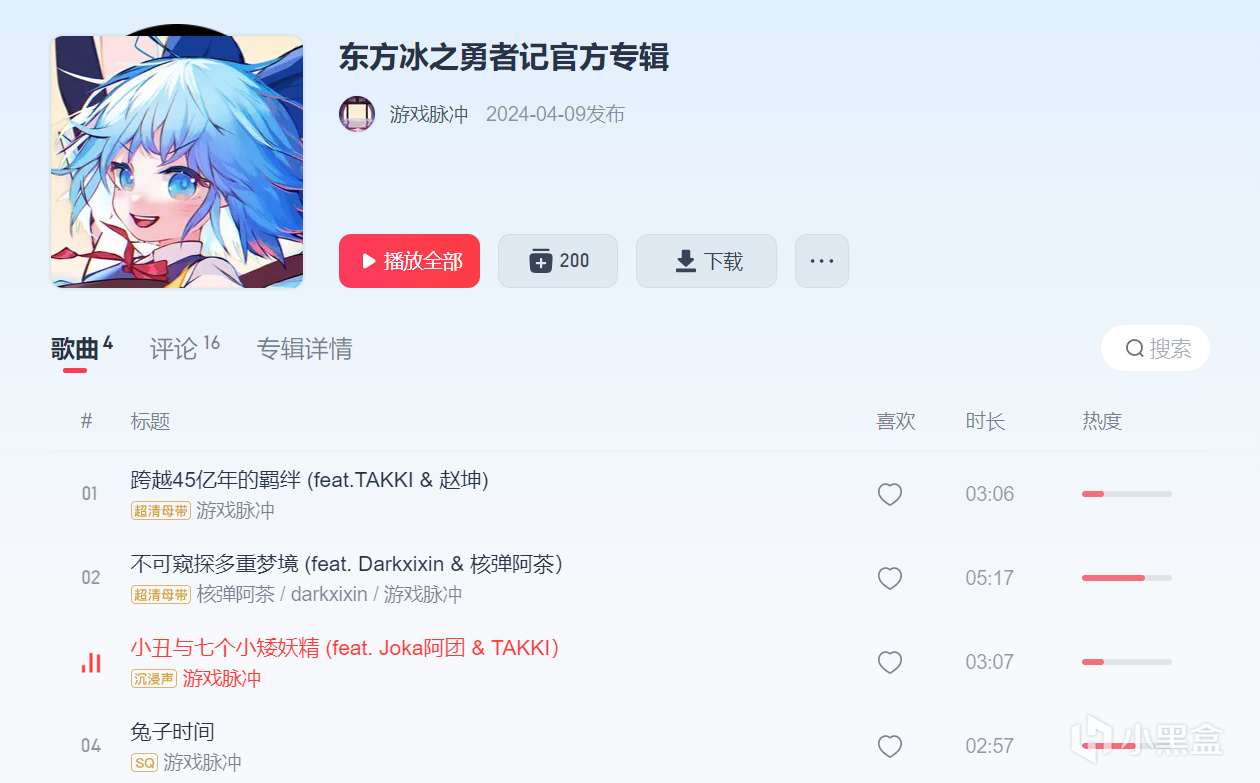 在網易雲上架了四首,大家搜東方冰之勇者記官方專輯就可以找到。