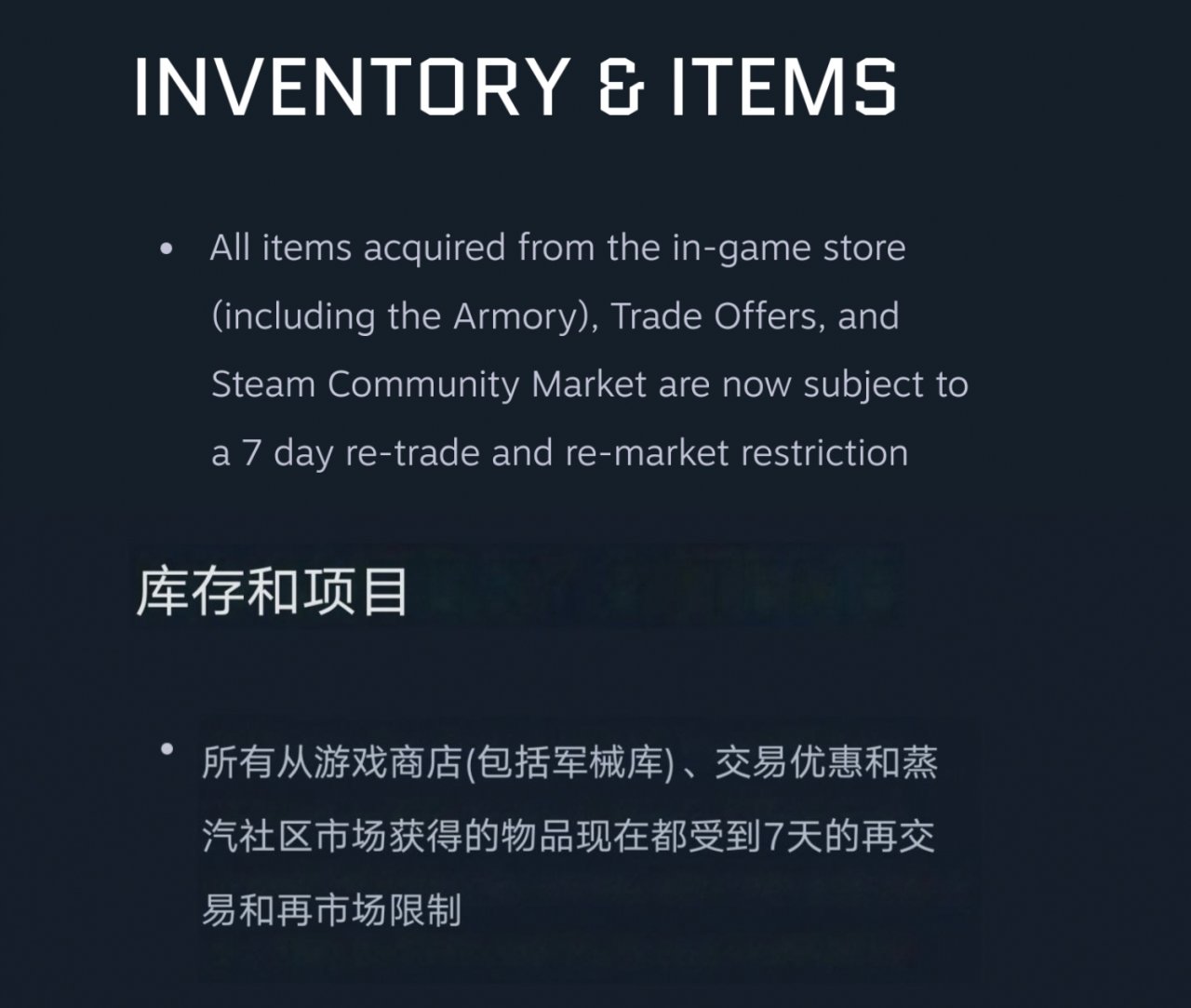 所有從遊戲商店(包括軍械庫)、交易優惠和蒸汽社區市場獲得的物品現在都受到7天的再交易和再市場限制。