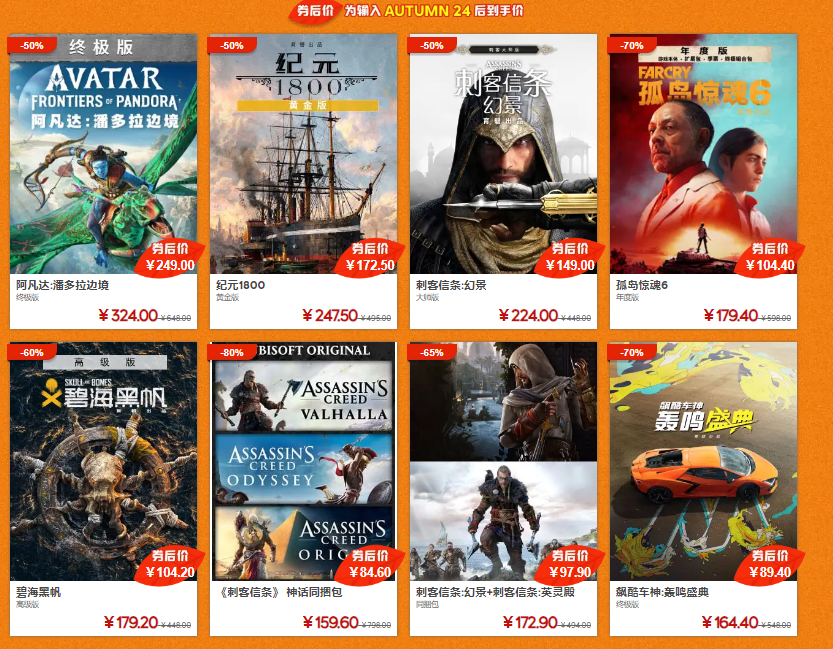 育碧商城已經開啓了秋季促銷,活動時間持續到 10 月 8 日晚 9 點;除了遊戲本身的折扣外,結賬時單筆訂單超過 150 元,輸入優惠代碼 AUTUMN24,即可立減 75 元!大家可以在十一小長假挑幾款自己喜歡的遊戲,湊單購買更優惠!