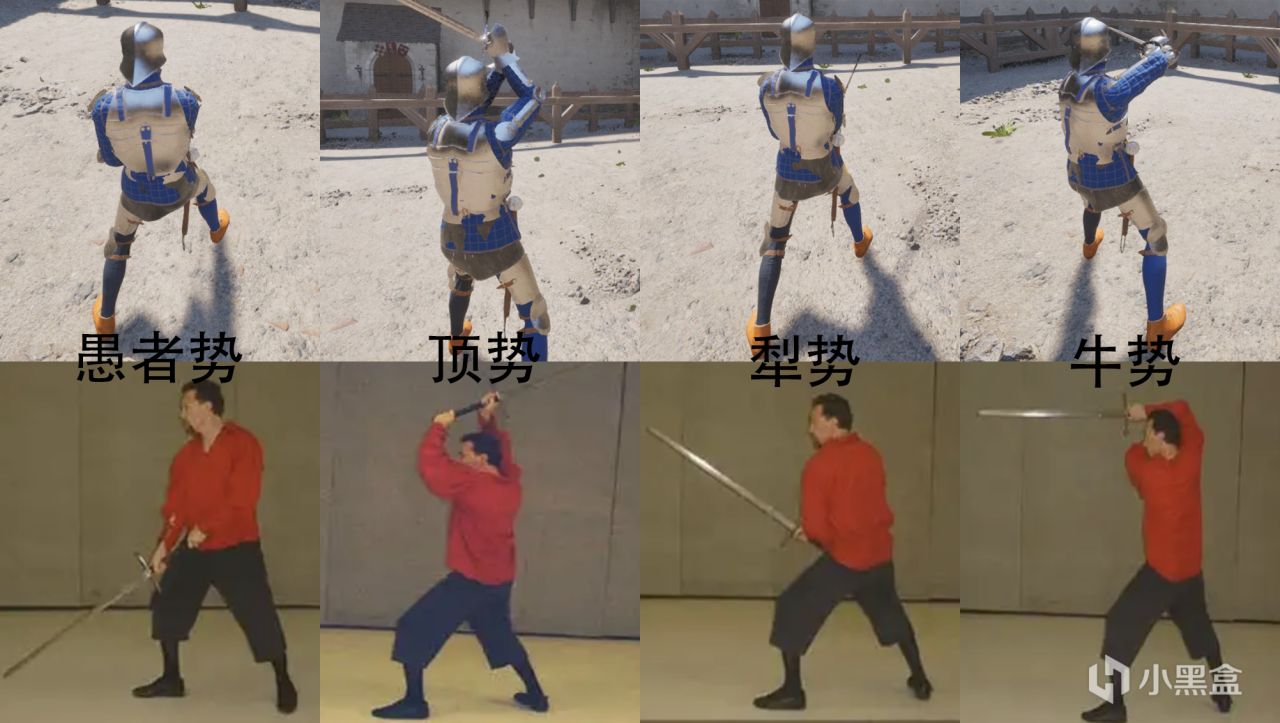 但事实上,游戏很好的还原了现实中梅耶长剑流派的四种架势:愚者势、顶势、犁势以及牛势