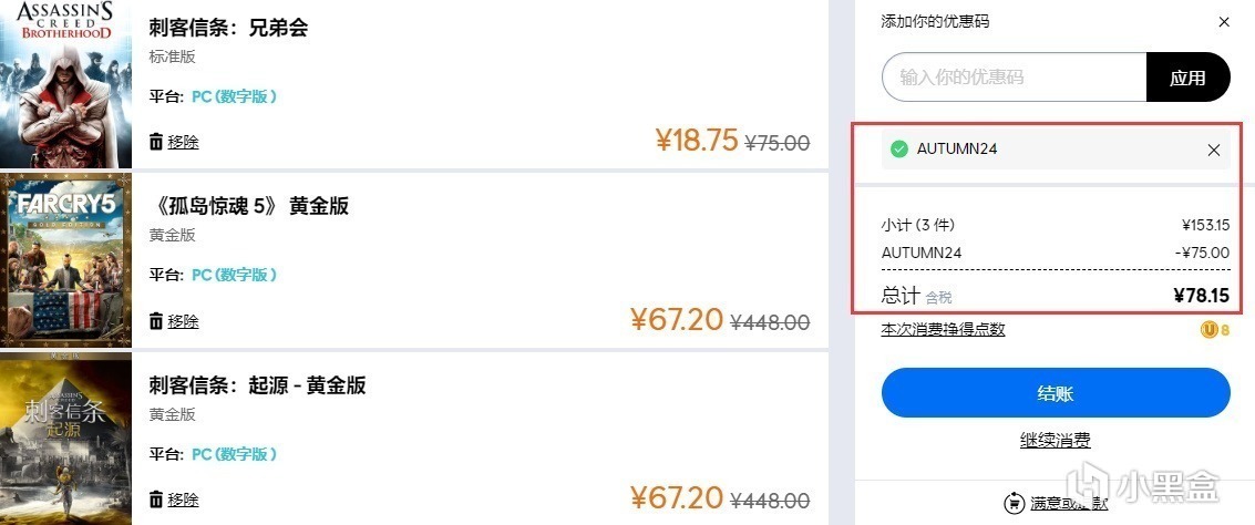 湊單可以是《孤島驚魂 5》黃金版+《刺客信條:起源》黃金版+《刺客信條:兄弟會》= 153 元,使用折扣碼 AUTUMN24 到手價 78 元: