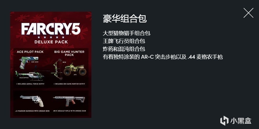 《孤島驚魂 5》的黃金版包含遊戲主程序、數位豪華組合包和(季票)。豪華組合包裏含有皮膚、載具和專屬武器等,這些特色內容不僅讓玩家的角色更加個性化,還能在遊戲中獲得不同的戰術優勢。