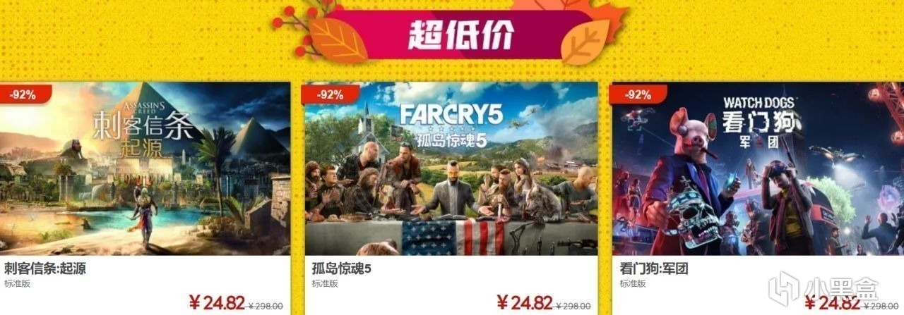 《刺客信條:起源》《看門狗:軍團》《孤島驚魂 5》這三款遊戲標準版限時特價 24.8 元,湊單滿 150 元還可以參加 5 折活動,低至 12.4 元!不僅如此,《孤島驚魂 5》的黃金版也迎來了史低價僅售 67 元(合理湊單隻要 33.5 元),感興趣的玩家千萬不要錯過這個機會!