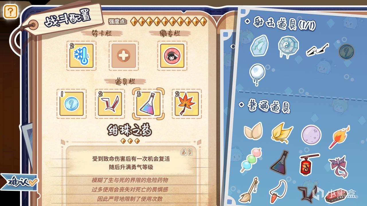 其餘三個欄位則用於裝配道具,道具大多擁有強力的效果,例如減緩彈速,提升勇氣,亦或者多一條命和額外造成傷害的手段等等,甚至僅有落地才能夠進行的下一次雪花飛行,在裝配道具後也能夠進行二連跳。