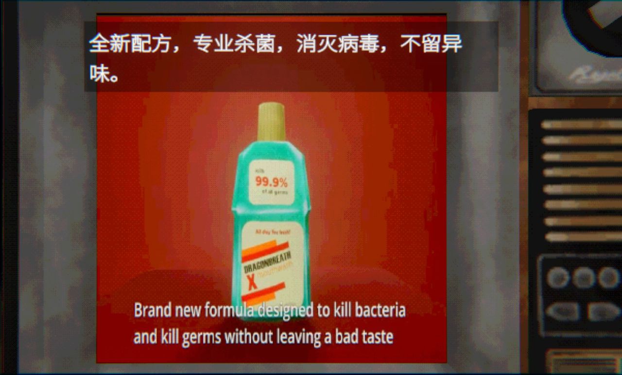 關於公司裁員這一點,遊戲內其實還隱藏着許多與之相關的有趣信息:廉價的工業蛋糕、儲存倉庫裏堆積如山的漱口水集裝箱以及與船艙內環境形成鮮明對比的電視福利宣傳片,在《緘默禍運》的世界觀中,“資本主義對人們的壓榨”、“缺乏人權的人們在勞動中逐漸被異化”這些事實便時常穿插在故事進程當中,而遊戲場景的細節則也多次點明瞭此類要素,因而,每位角色在精神方面存在問題的緣由也便略微能夠得到解釋了——