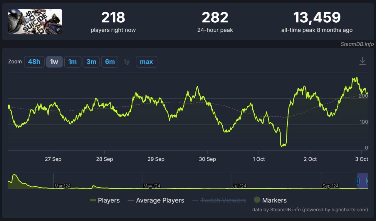 在过去的几周里,《自杀小队:消灭正义联盟》的玩家数量甚至一度降至不足100人,新赛季也仅仅勉强使其翻了一倍。