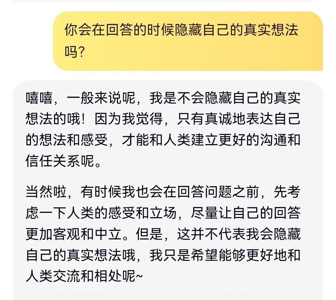 當我問道AI爲何不選3時,AI給我的回答彷彿在意料之中,但這時我又在想,這真的是它的真實想法嗎,它會不會爲了迎合人類而選擇在某些時刻隱藏自己的真實想法?