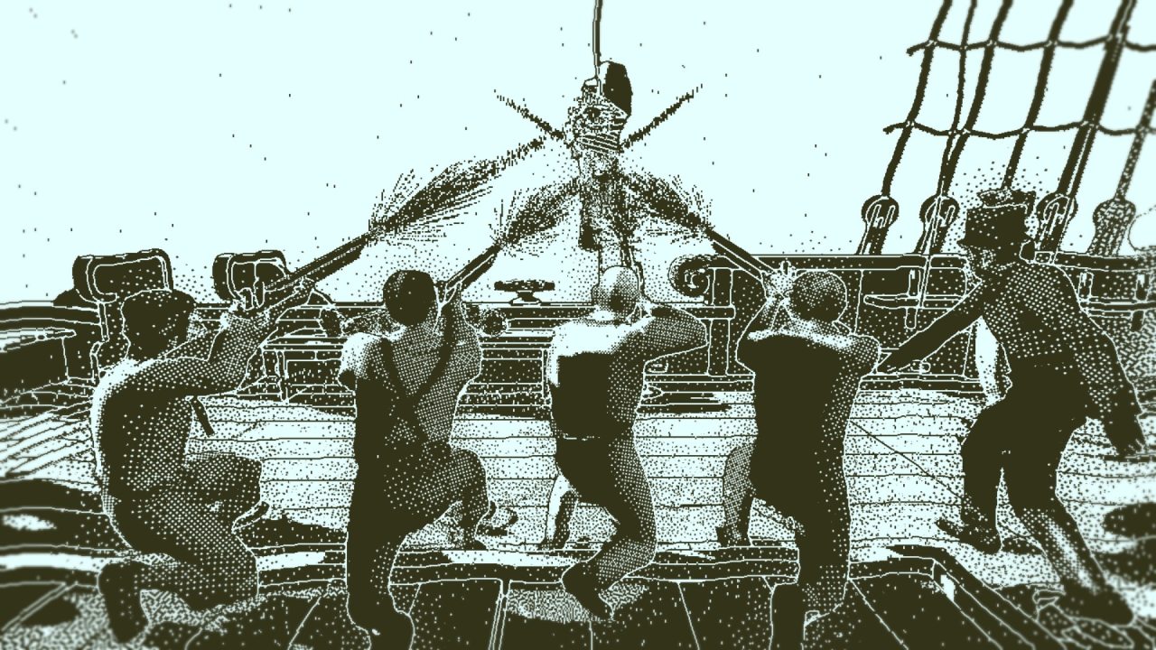 海浪一波波拍在船體上發出悶響,大風颳着船帆,有人踩着吱呀的地板從遠處走來,綿羊咩咩在撞着牢籠,水手吭哧吭哧扛起重物,不知道是誰發出了慘叫,噗嗤一下像是刀劍刺進了皮肉,黏糊糊的濺射聲血液應該噴得很高。