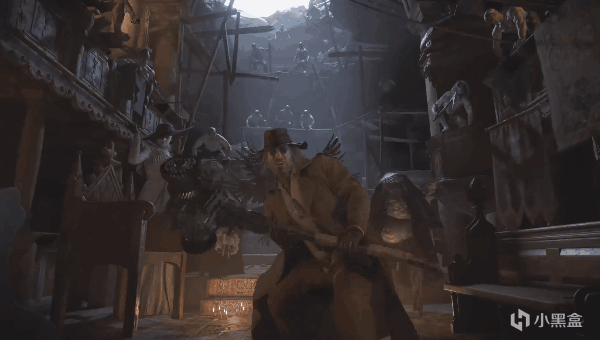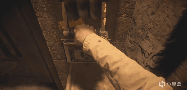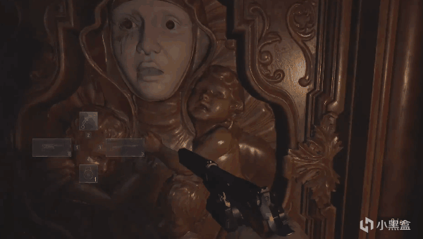 來到禮堂後,伊森推開石棺拿出了裏面的彎刀,這時夫人會從後面一把將他提起來。
