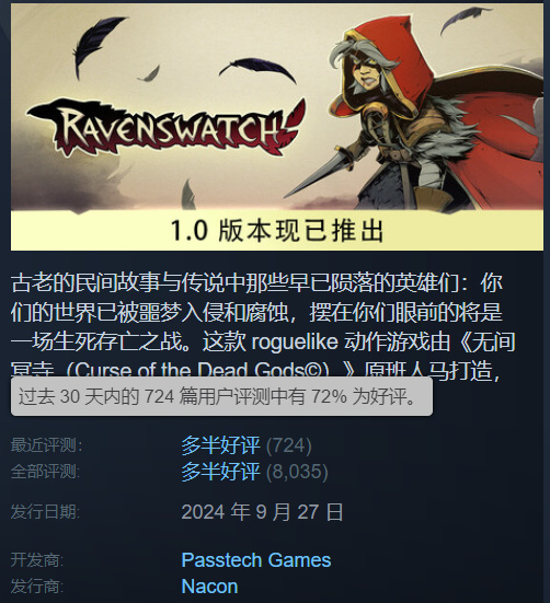 不過讓我始料未及的是,在經過漫長運營本作的好評率終於從剛發售時的褒貶不一爬升到了接近80%的多半好評,但是正式版發售後所帶來近30天評價卻回到了72%,只能感慨因爲正式版發售雖然又讓《鴉衛奇旅》刷了波臉,在線峯值逐步走高,已經接近當初剛發售時的1W+,不過根底上的一些數值調教卻依然沒有解決,即便有自定義模式,始終是多了許多額外的繁瑣步驟,因此目前的大部分差評更像是針對遊戲最初版本那些略顯惡意數值的不滿。至於本作最終的結果,我想未來也很清晰:把玩家所抱怨的點都落到實處,挨個解決就是了——首先便從數值做起。