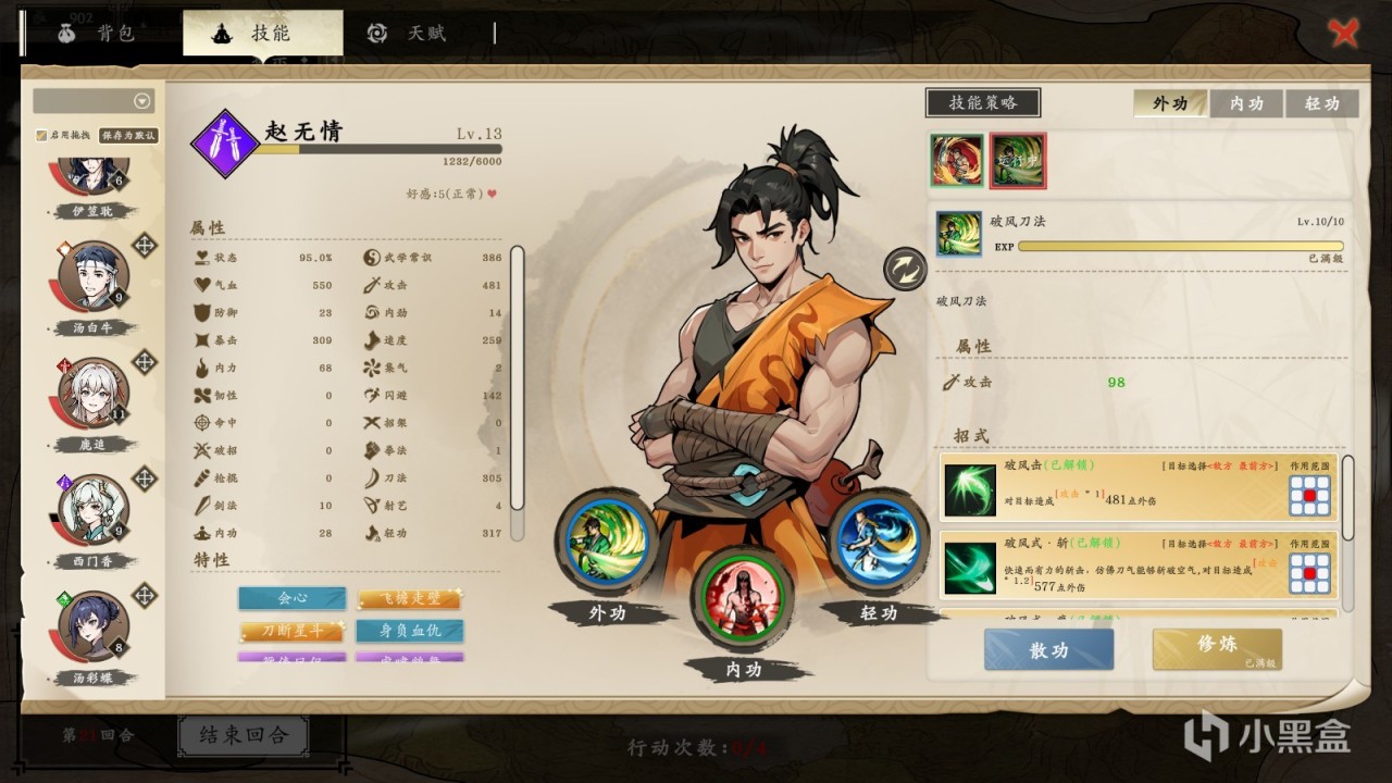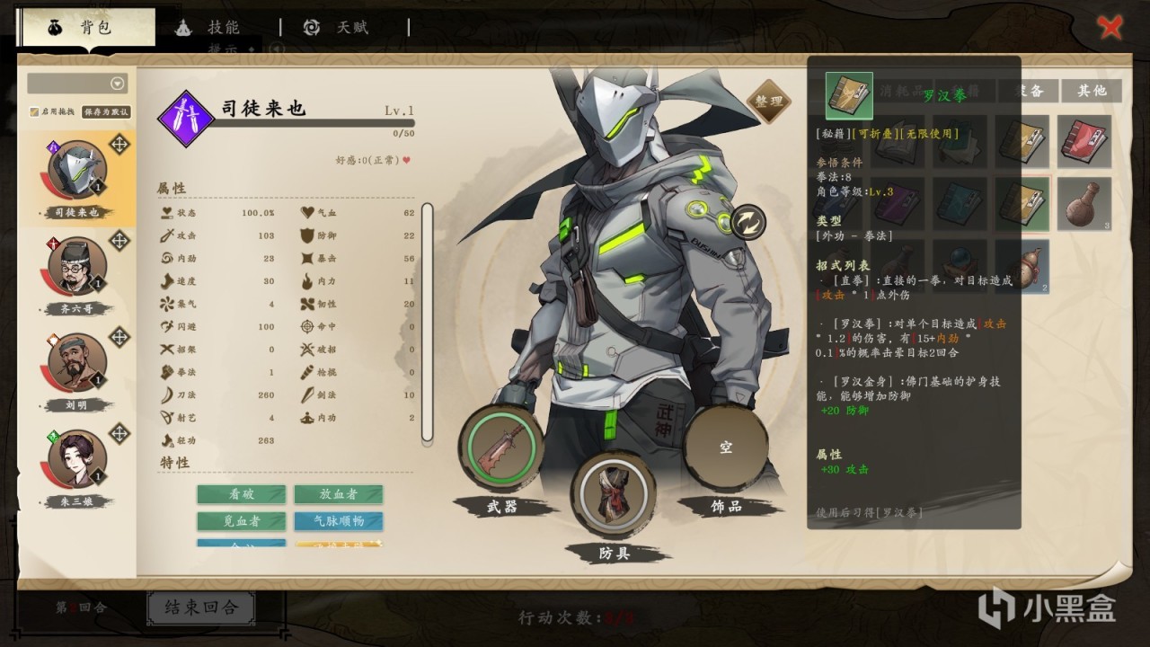 当然像是交易、学习功法等是不需要消耗行动次数的。玩家可以随意的进行安排,不过整体看【4】的行动次数,还是比较少的,很多时候有些忙不过来。这里大家还需要注意一点,玩家控制的角色,是有上阵次数限制的。在玩家的回合时,如果使用角色参与了战斗,那么在接下来电脑的回合,如果对方发起进攻,则有可能无法上阵(普通难度,除主角外其他角色只能上阵一次)。