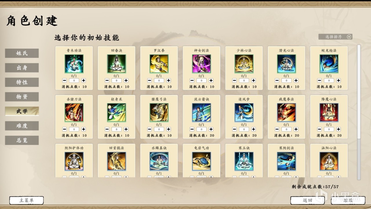 游戏中的功法分为三大类:外功、内功、轻功。其中外功根据使用武器的不同还分为:拳法、刀法、剑法、棍法、射艺。玩家使用的主角初始为刀法,但也可根据自己的喜好学习对应的功法书更换即可。