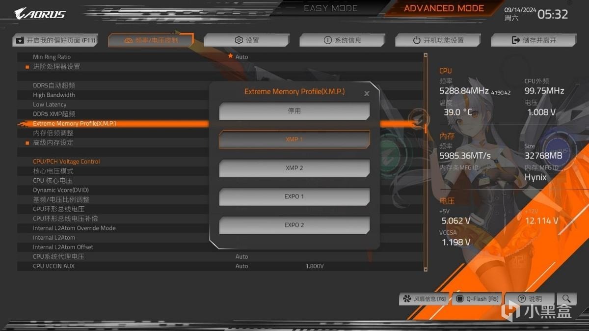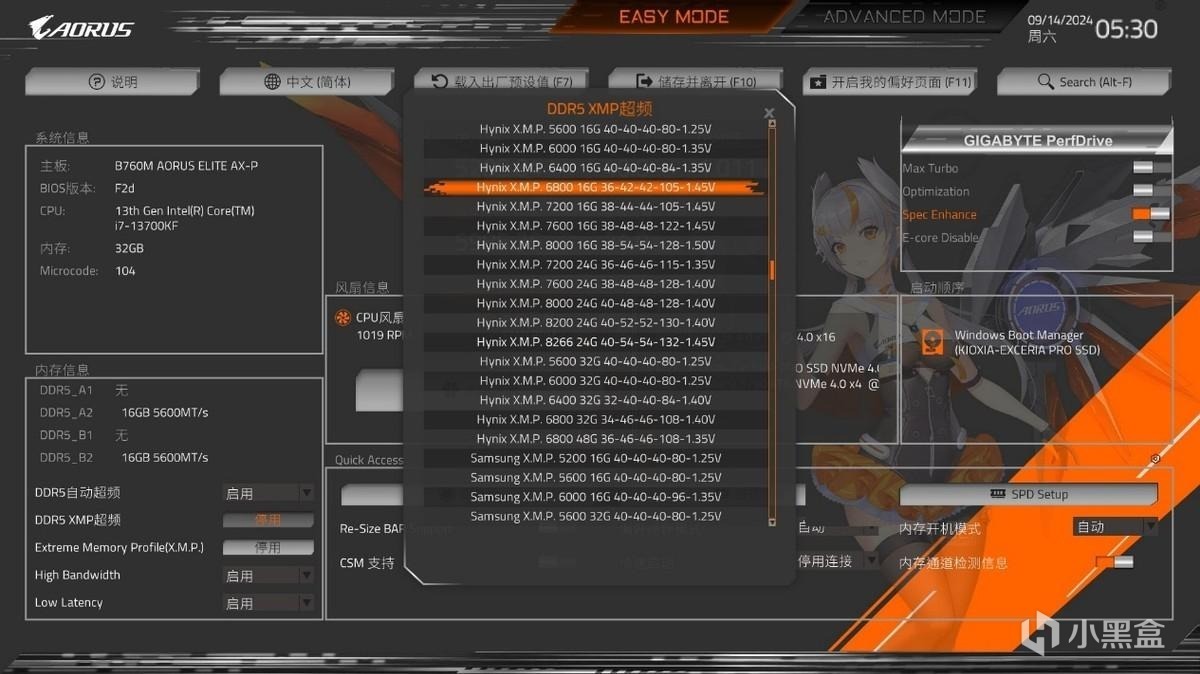 下面超一下探索探索性能极限,雕妹2.0主板的内存超频确实好用,已经预置了海力士颗粒的参数,可以直接选用。