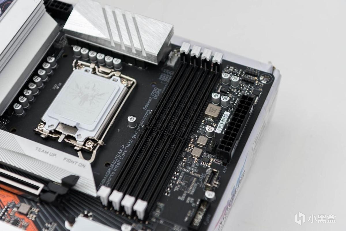 开箱可以看到I/O挡板上的散热装甲上的雕妹形象,整块主板的视觉引导突出点在CPU左侧马甲上的雕妹立绘图案, 配色是黑色底板外加银色装甲的黑白主色调,比较主流的撞色系,会给一定的视觉引导到装甲上,突出装甲质感,外加橙色斜条纹引导线的修饰,整体有不错的金属机甲风格。
