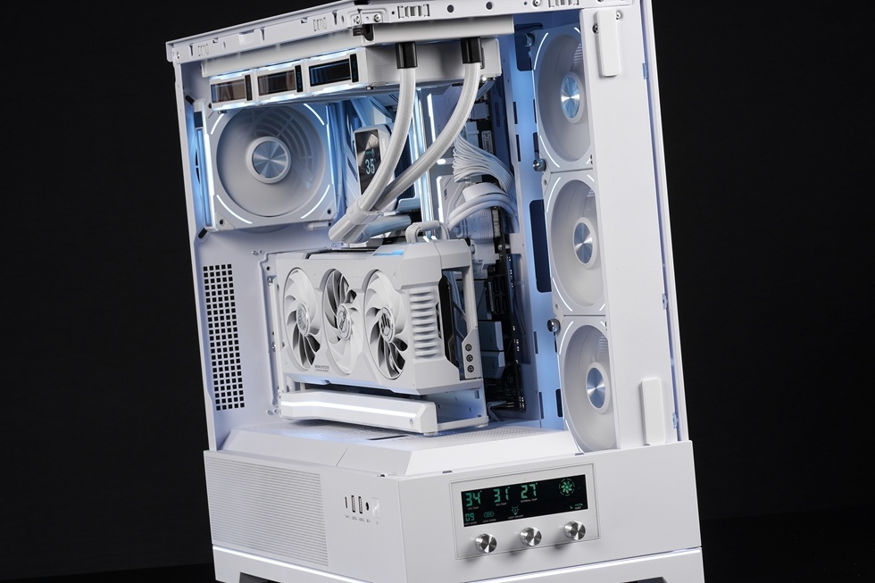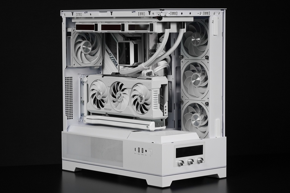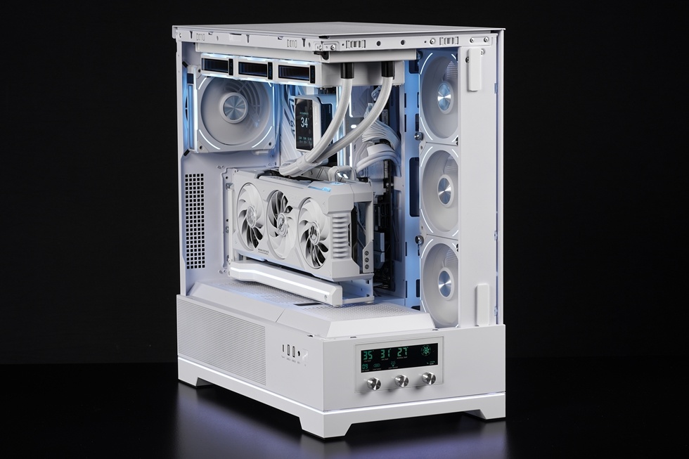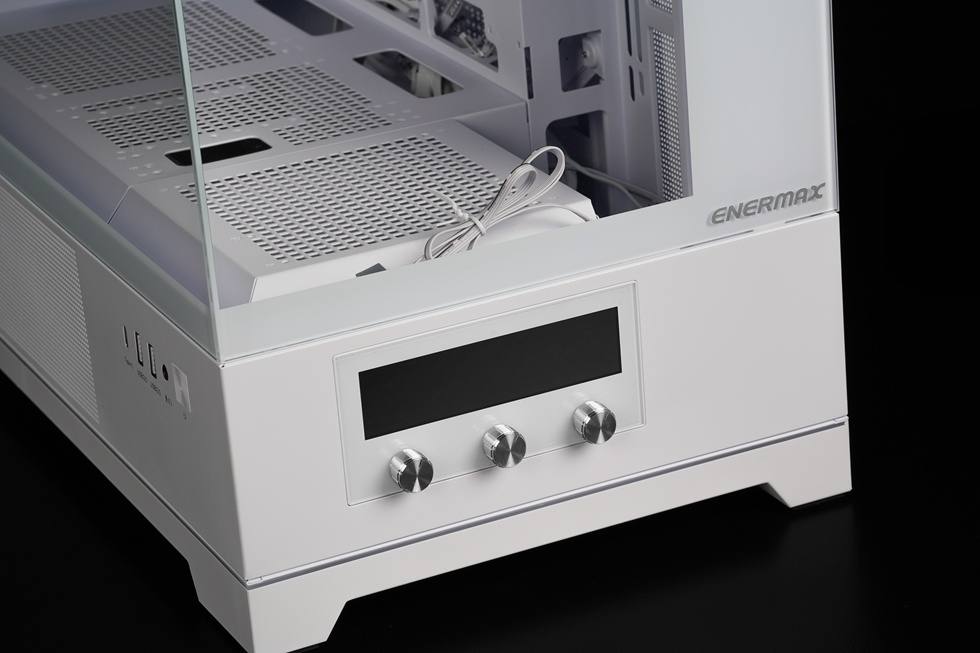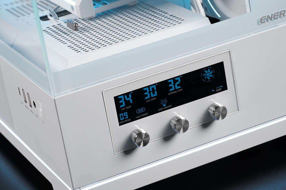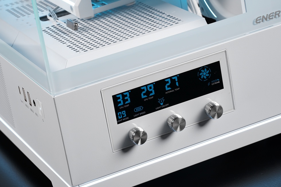 机箱的特色功能之二,前置面板提供一块液晶屏幕以及3个机械旋钮,分别提供灯光模式切换以及风扇四个档位的快速调节。