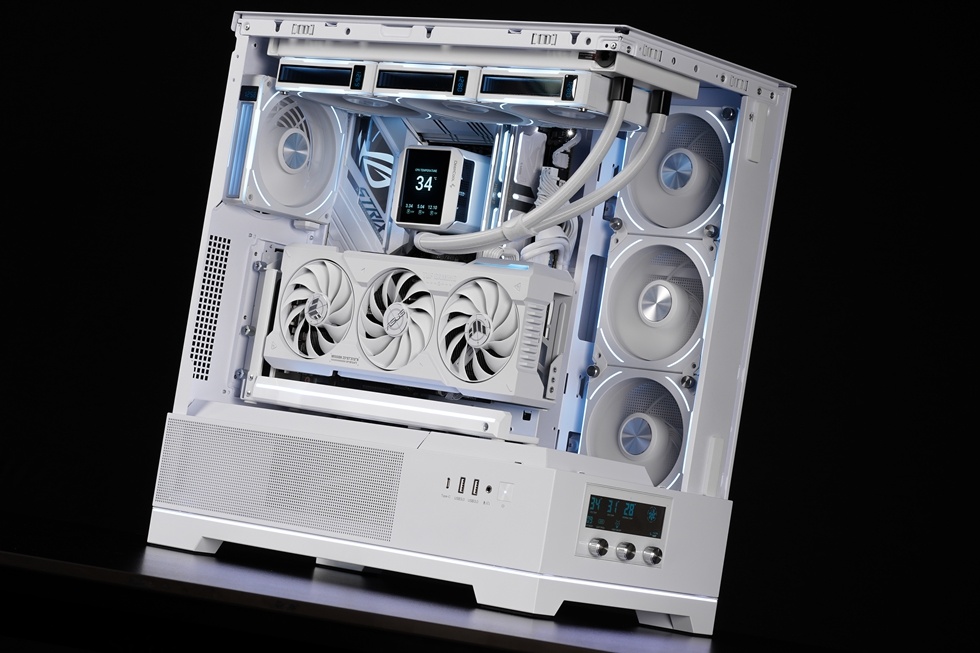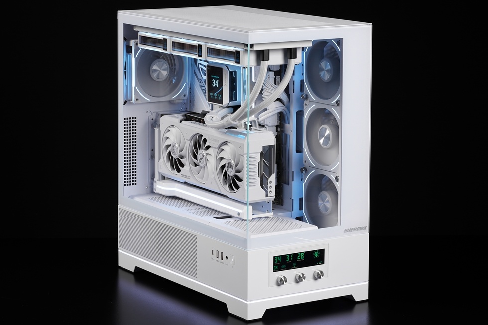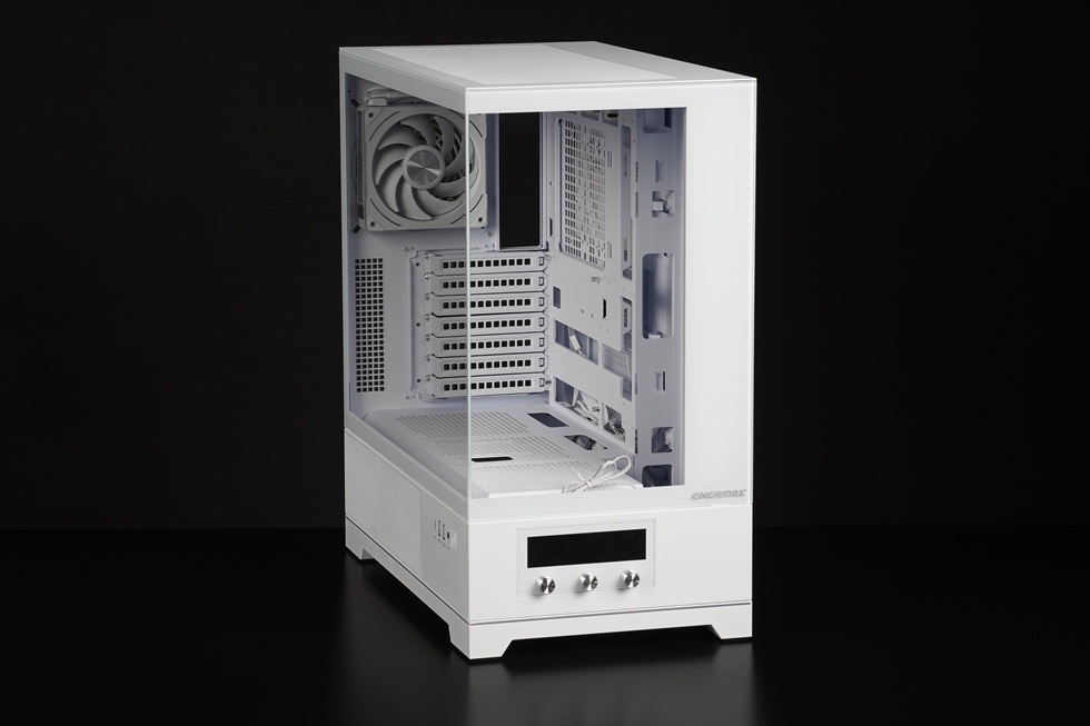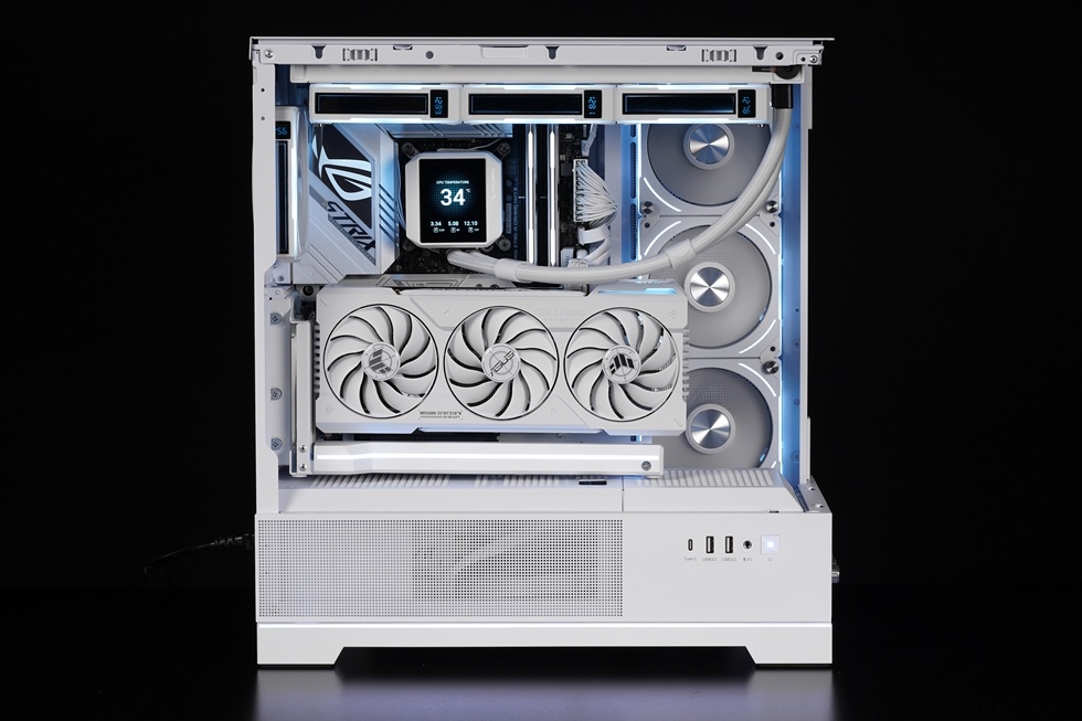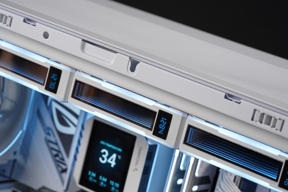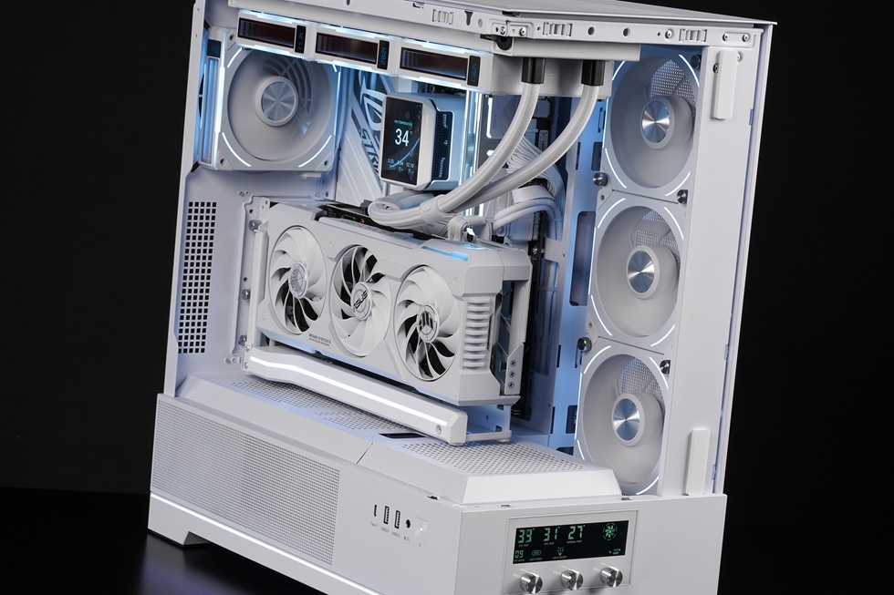 机箱的特色功能之二,前置面板提供一块液晶屏幕以及3个机械旋钮,分别提供灯光模式切换以及风扇四个档位的快速调节。