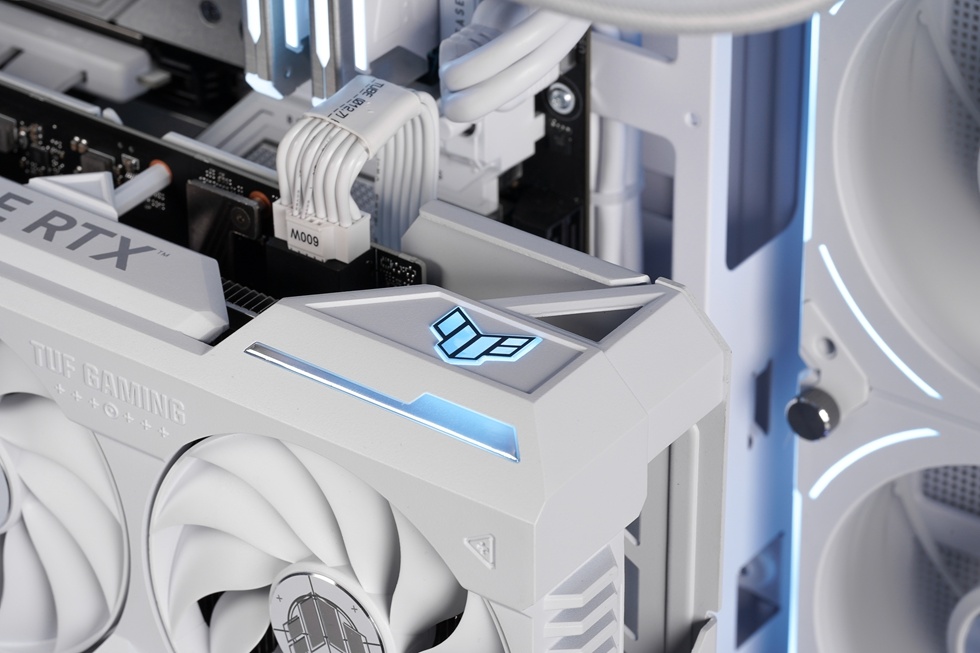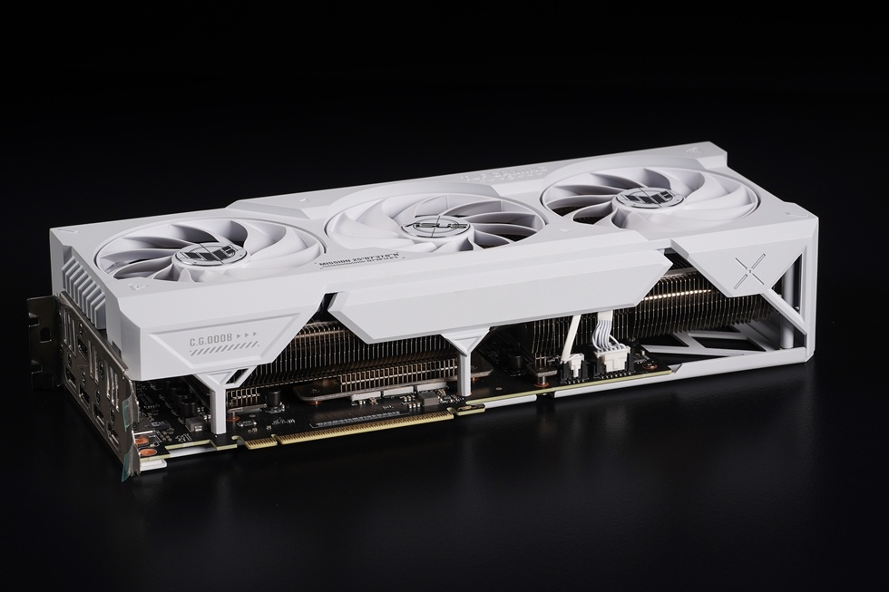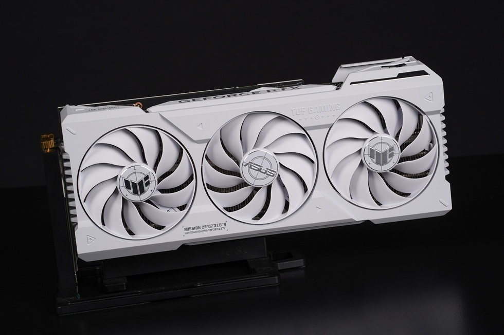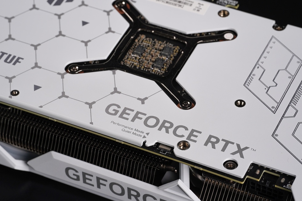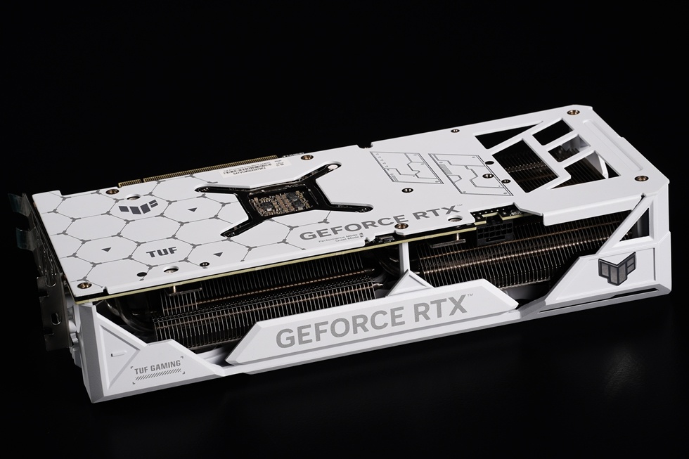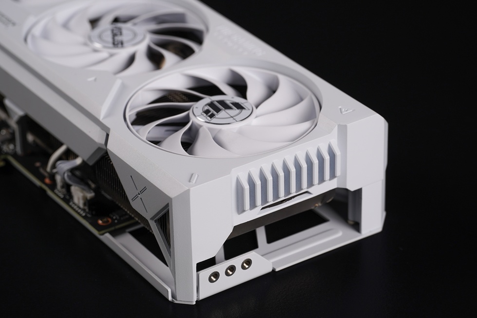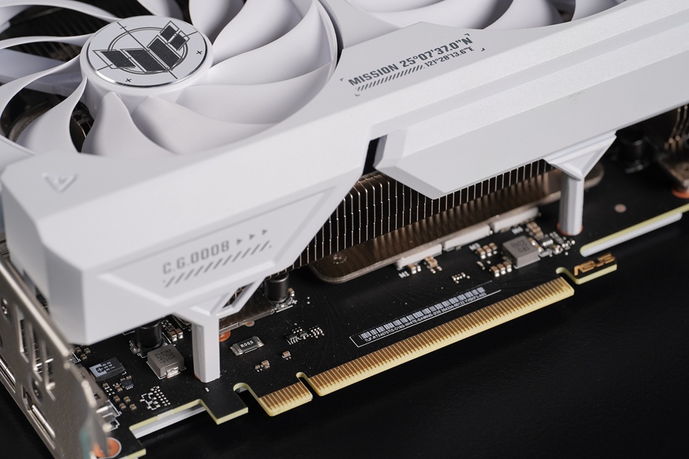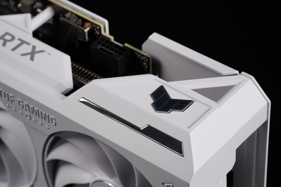 整卡设计沿用了新版TUF GAMING的家族式设计,外观造型上依旧主打硬朗的军事风格。显卡导流壳采用哑光白配色,表面的金属拉丝纹理变为了磨砂处理,配合冲压和切割造型,整体观感非常的硬朗简洁,质感提升明显。
