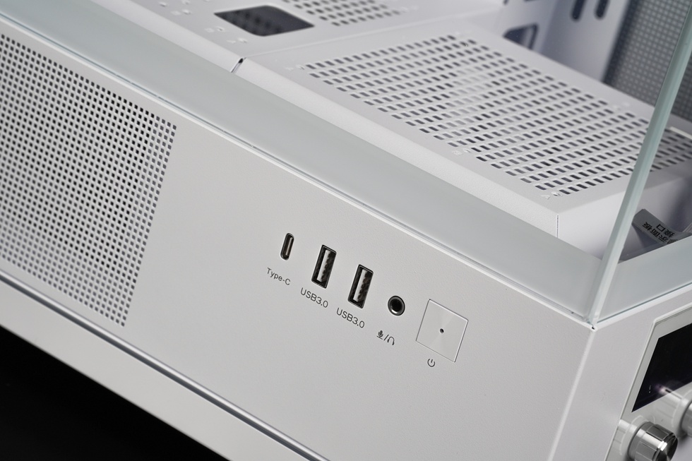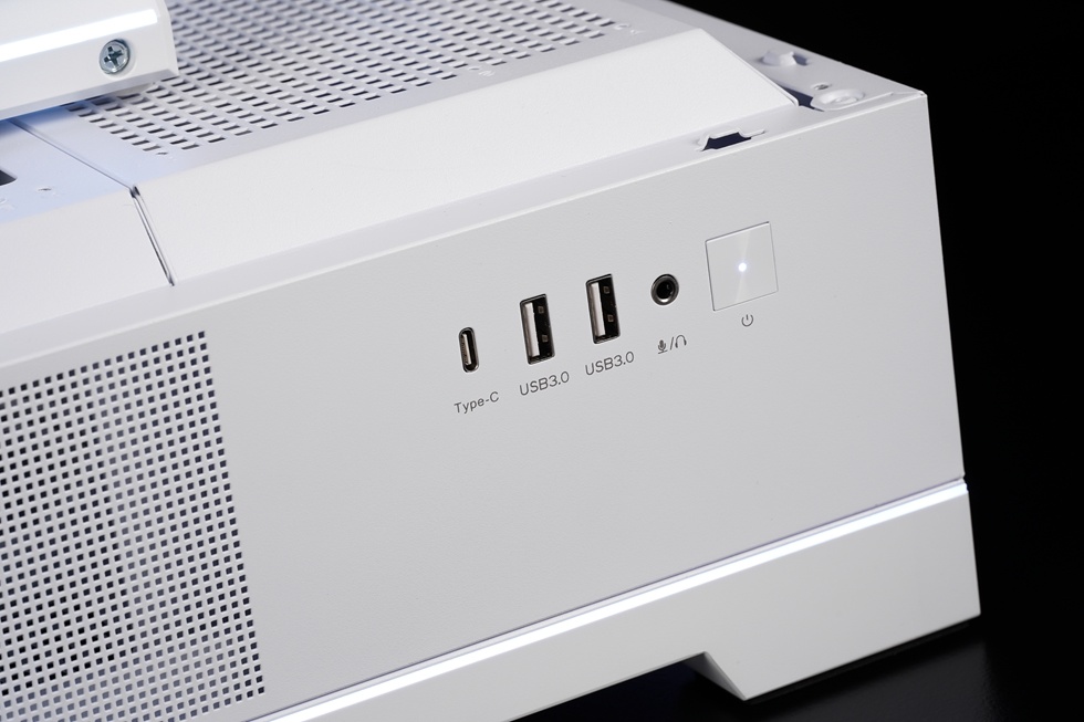 机箱IO面板接口分别为TYPE-C*1,USB3.0*2,3.5mm音频二合一,开机键。