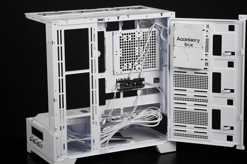 机箱的特色功能之三,提供了一个风扇4PIN、12V ARGB集成HUB,可以通过前置面板进行全机箱的风扇和灯效统一控制,同时提供了一个磁吸的盖板,盖板上支持安装硬盘的同时,可以遮挡背部走线,看起来更简洁。