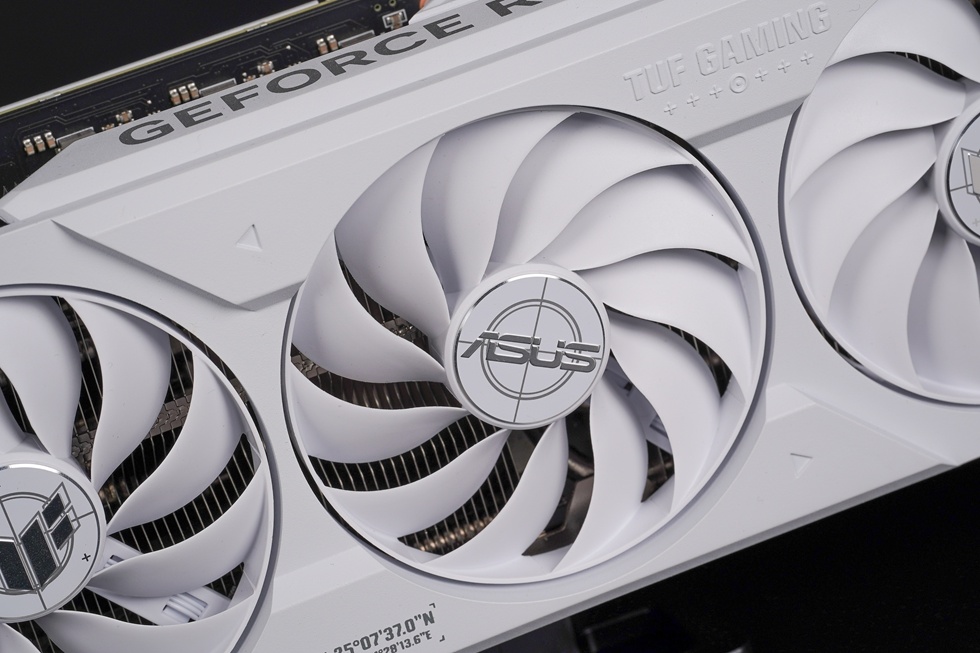 显卡正面采用了3枚全新的Axial-tech轴流风扇,中央风扇与两侧辅助风扇采用正逆转工作设计,可以减少空气乱流,提高散热气流利用率。3个风扇都保留了全高阻隔环,能大幅提升静压,使其更容易吹透鳍片。风扇也支持低负载完全停转的技术,当GPU温度低于50℃时风扇将停转,降低显卡低负载运行时的噪声,风扇中心印有华硕和TUF的品牌LOGO。