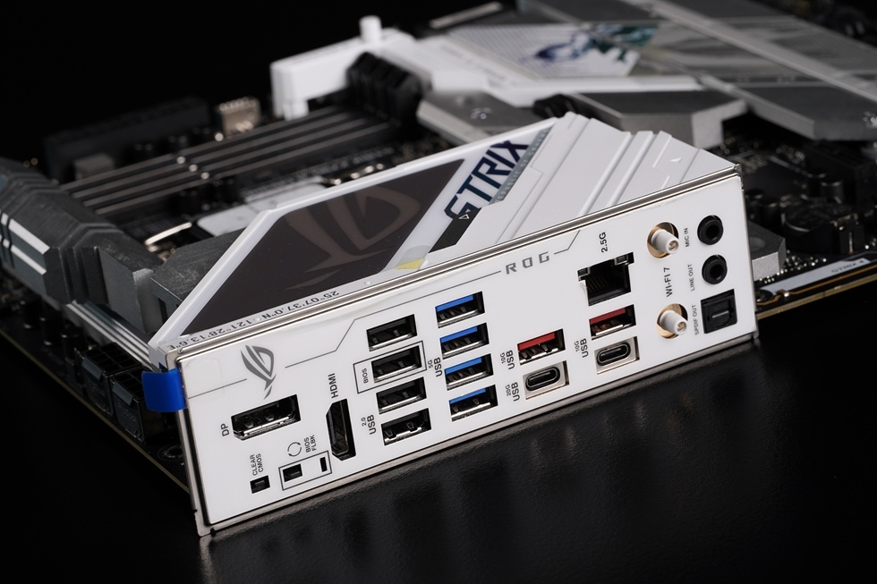 一体式的IO背板,同时做了白化处理,接口方面:DP/HDMI接口各1个、CMOS清空按钮、BIOS更新按钮、4个USB 2.0接口、4 个 USB 3.2 Gen1 5Gbps Type-A 接口、2个USB 3.2 Gen 2 10Gbps Type-A 接口、1个USB 3.2 Gen 2 Type-C接口、1个USB 3.2 Gen 2x2Type-C接口、2.5G有线网口、还有全新的Wi-Fi 7 易拆卸天线接口以及2个3.5mm+1个S/PDIF光纤输出的音频组合接口。