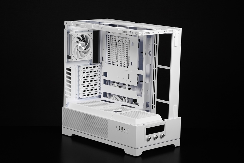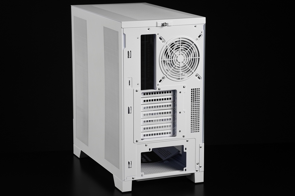 尾部上方支持一个12cm风扇,同时机箱做了一个网罩格栅,看起来很有机械感,下方提供7个PCI插槽。