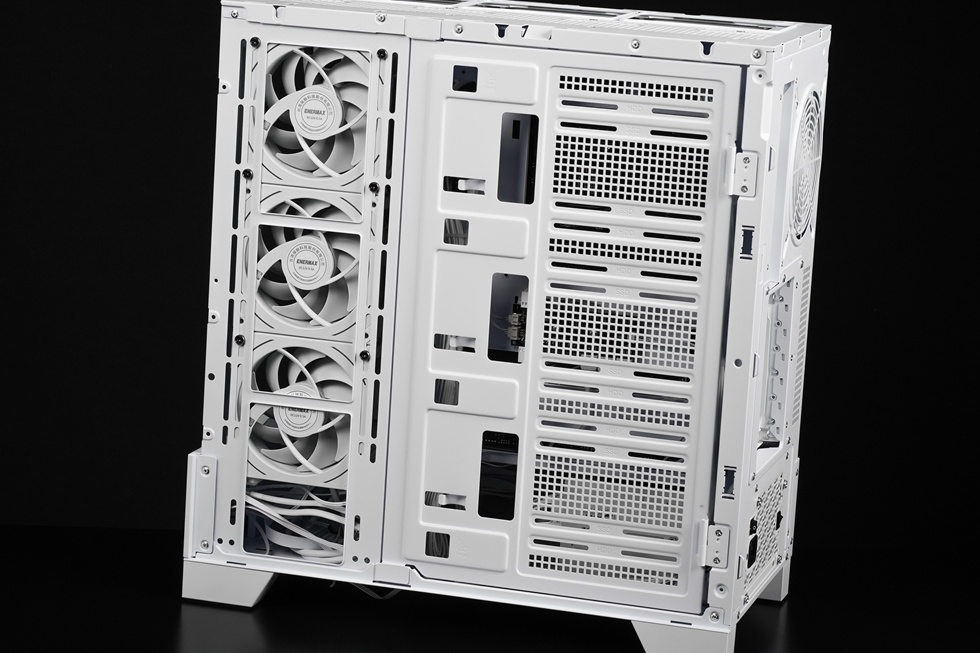 拆掉背板,露出内部,可见侧面风扇位,支持12cm*3风扇 or 360一体水冷安装。