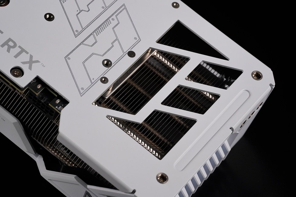 显卡背部采用全金属背板覆盖,并在尾部做了镂空设计可以增加散热效率,显卡三维尺寸为:305mm×138mm×65mm,显卡厚度为3.25槽。