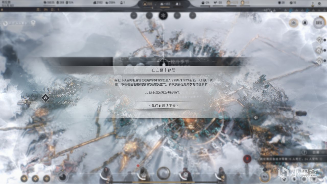 巨大的能量塔高高聳立在一片冰天雪地之中,它的視線所及之處即意味着生,它的臂膀之外即意味着死。它就像聖女貞德,以自身之軀同即將吞噬一切的寒風所抗爭到底。就像是《進擊的巨人》中,百姓在三座牆壁的庇佑下暫且逃離了巨人的追捕,於是“牆教”的宗教隨之應運而生一樣。隨着能量塔幫助我和我的居民們一次又一次地度過了寒潮的追獵,到了遊戲後期,能量塔在我心中儼然有了一抹女神般的光輝。