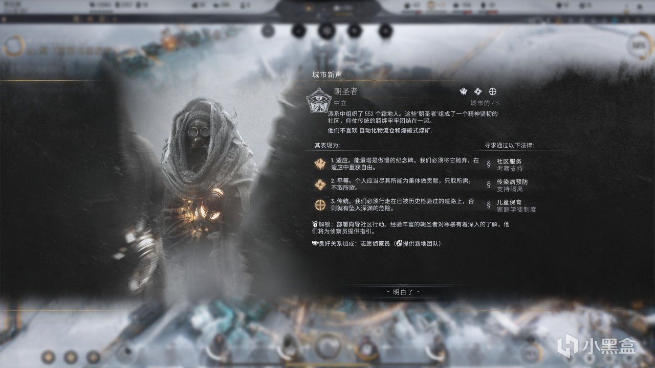 在前作中也存在着這樣對於次要事件的描繪,但是更多的,是藉助傳統的道德拷問把玩家架在火上烤,強迫玩家在生存與人性之間做出自己的選擇。本作中的次要事件就有了更爲細緻化的個人傾向描寫,你做出的每一個決策、通過的每一項法案、研製成功的每一種科技、城市究竟是更公平還是更效率……藉助次要事件的描繪,你的所作所爲都有了最爲直觀的反饋,百姓究竟在你的統治下過着一段怎樣的生活,在本作中終於可見一斑。