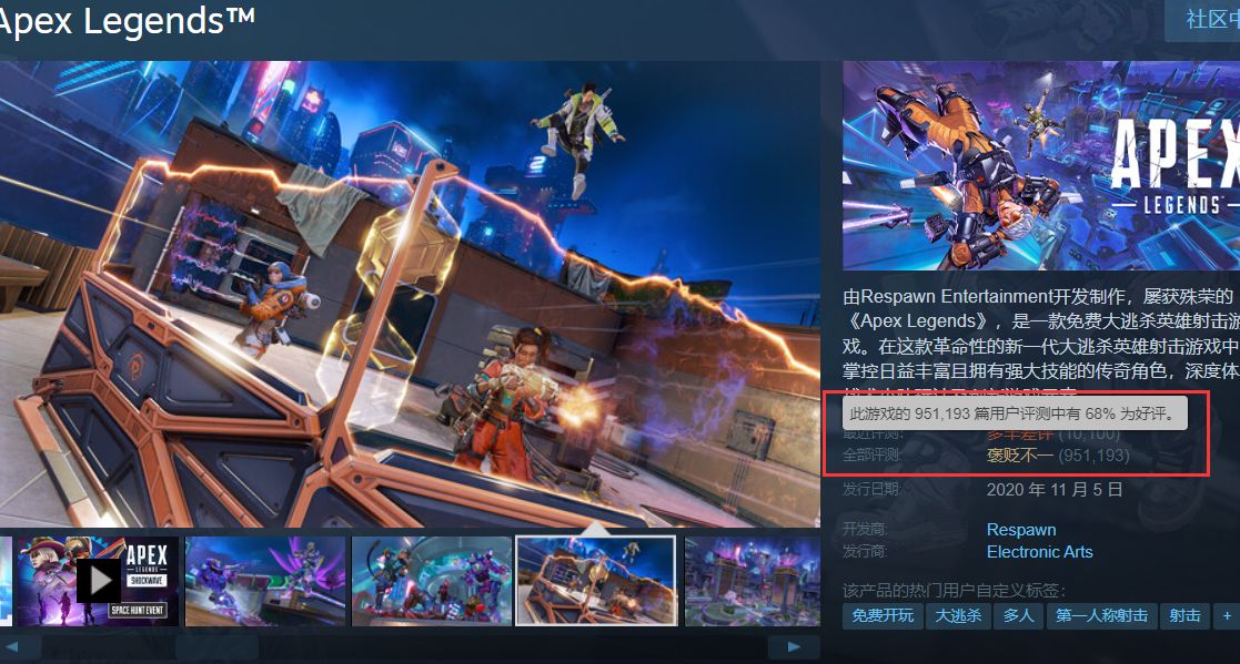 目前《Apex 英雄》在 Steam 上的總體評價爲“褒貶不一”,好評率僅有 68%,近三十天的評價爲“多半差評”: