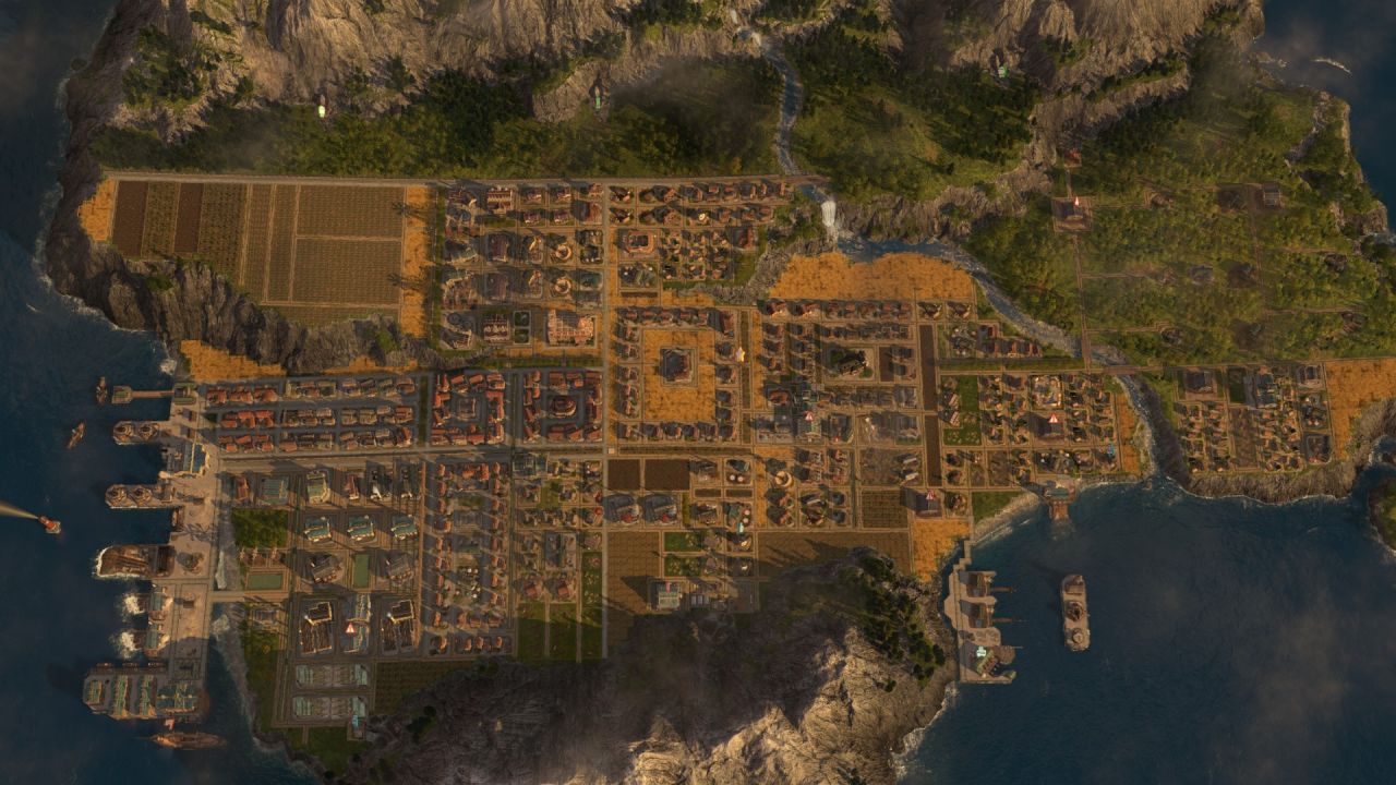 地圖是原版劇情所在的溝中死水島,名字被我改爲海角灣,原因是我第一艘軍艦叫天涯艦哈哈。因爲我已經玩到後期,金幣物資爆倉,所以並不像很多玩家以圍繞市政局,工會以及公共服務爲基礎的圓盤形佈局,我的理念主要還是哪裏好看哪裏整齊就把建築塞進去,也力求在一座島嶼上塞下所有裝飾包的內容,這是海島多樣性與包容性的一種體現(正經臉)。以下是海島的大致佈局: