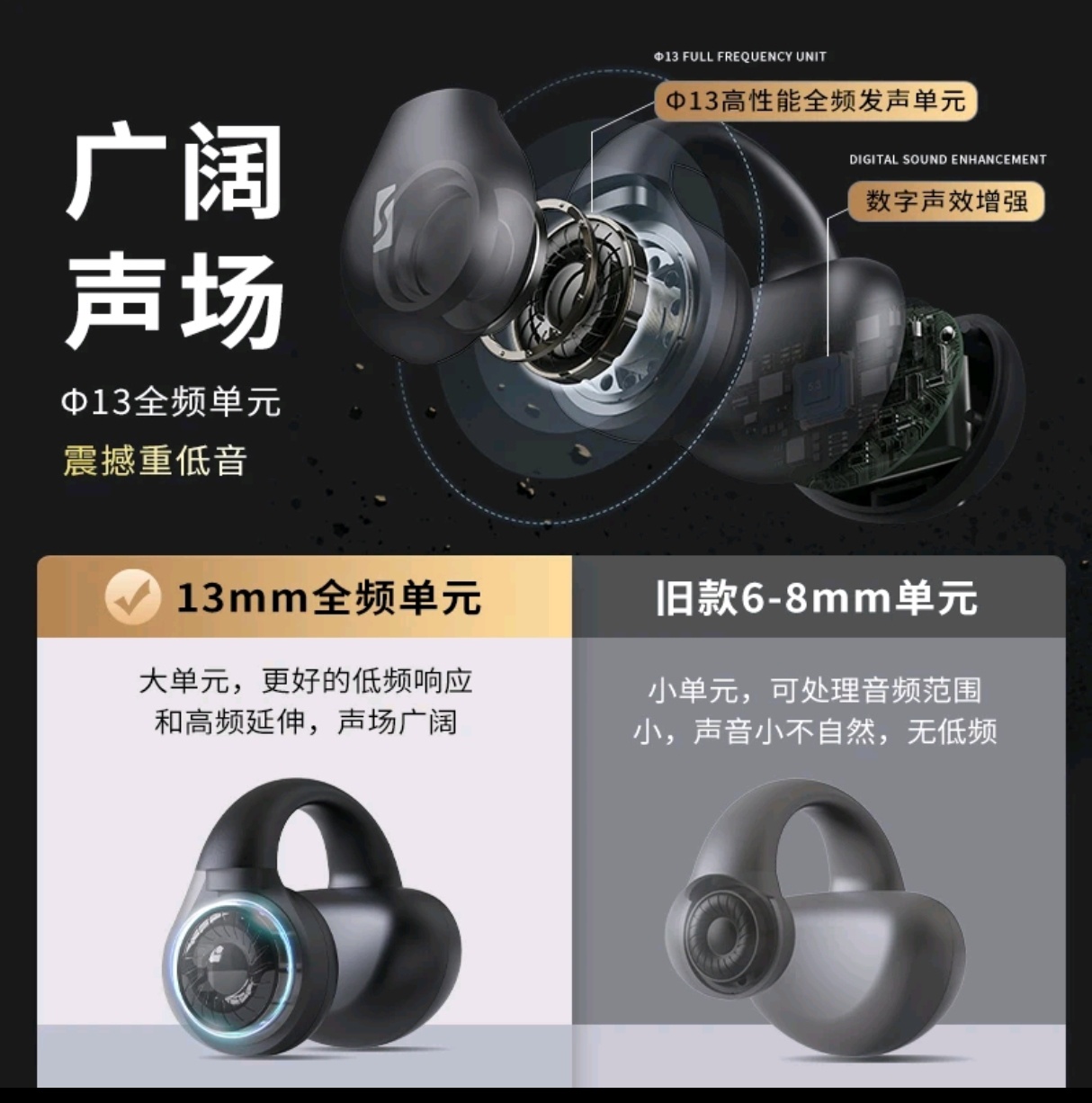 也是展示一下這代的提升,選擇了目前主流入耳式耳機的13mm發聲單元,雖然不如市面上的大多數掛耳式,但是在夾耳耳機中已經是佼佼者了。更大的發聲單元也就意味着聲場更廣。