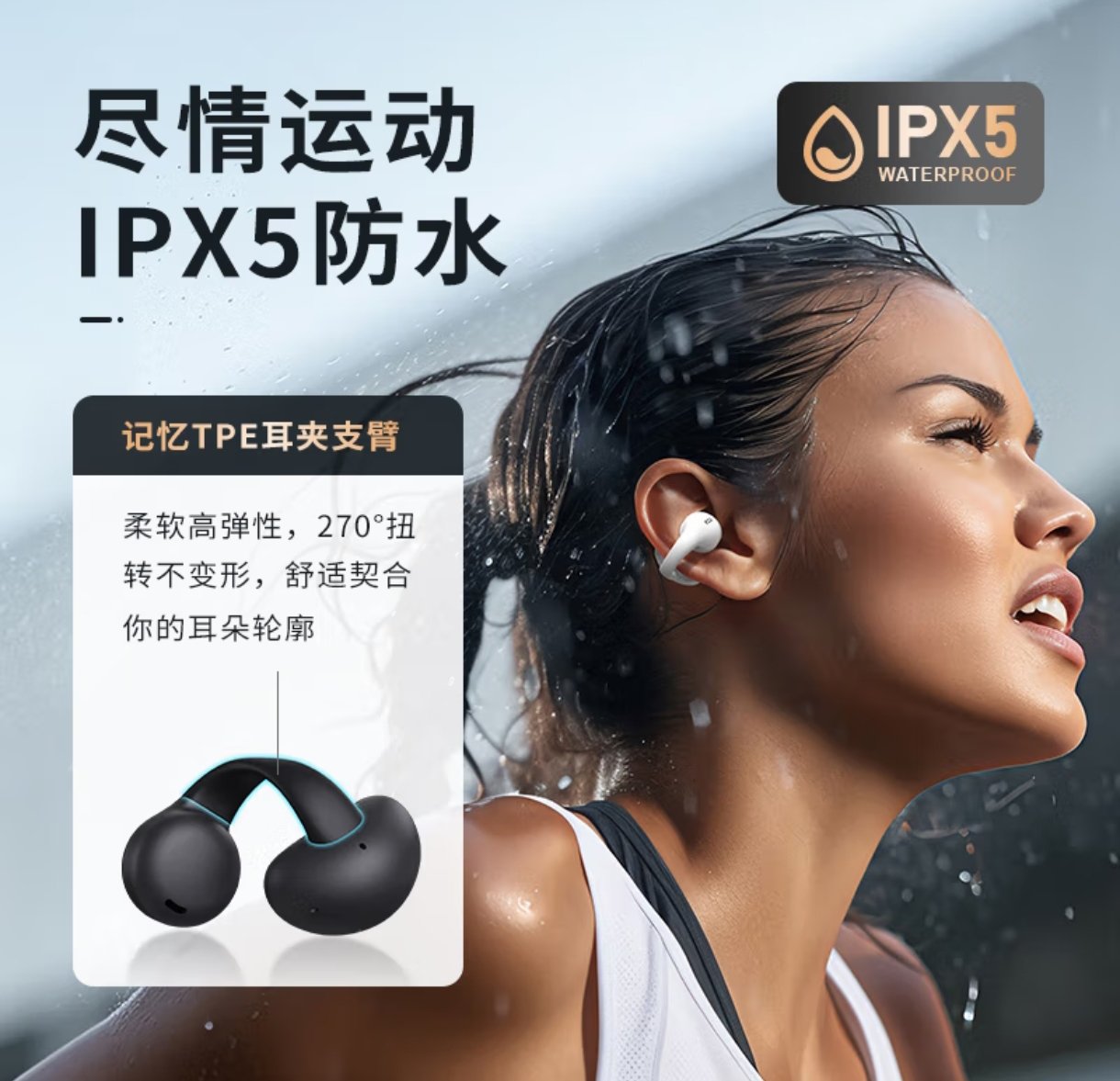 IPX5級生活防水功能,記憶TPE耳夾支臂,柔軟高 彈性,270°扭轉不變形