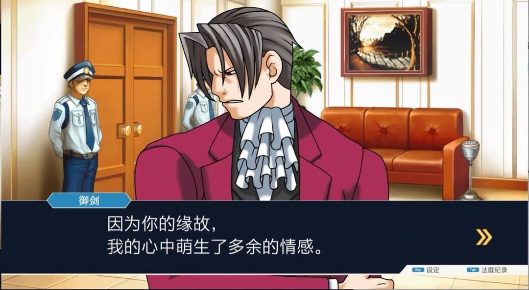 也就是在這一章玩家對御劍有了更加深刻的印象,御劍並不只是一個傲嬌(你就看到了這個?)好吧,其實是御劍和那些檢察官不同之處在於御劍是有正義感的,或者是是御劍的律師父親多多少少還是影響了御劍,讓他不像某些律師一樣道德敗壞(說的就是你狩魔)